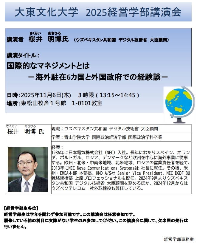 【経営学部生各位】 経営学部生は学年を問わず参加可能です。この講演会は任意参加です。 履修している他の科目に支障がない学生のみ参加してください。この講演会に関して、欠席届の発行は 行いません。