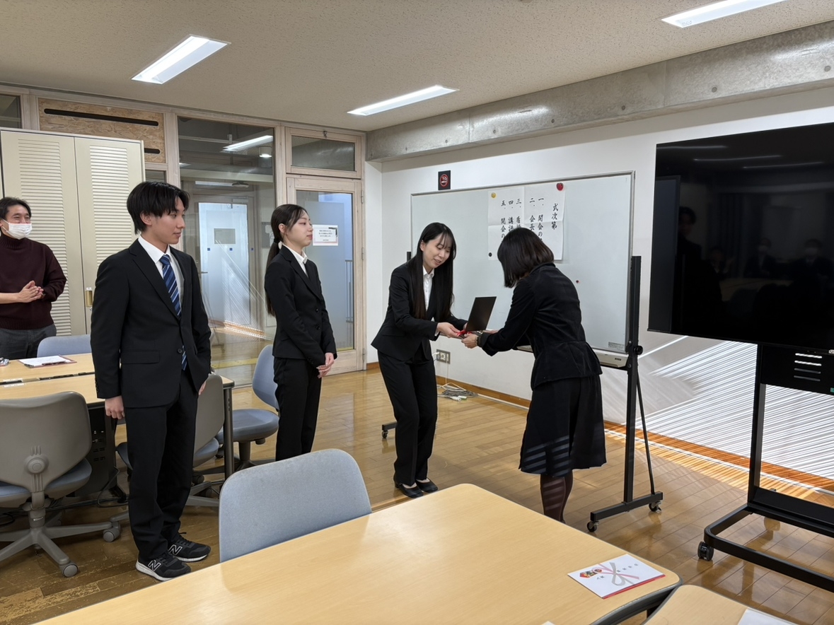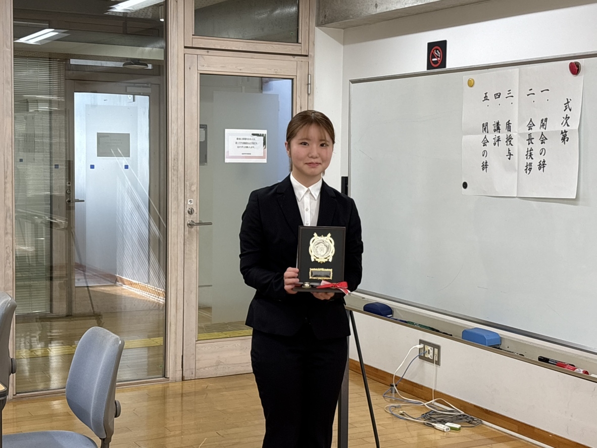 はじめに、経営学会長である佐藤史子教授よりご挨拶をいただき、盾と賞金の授与が行われました。