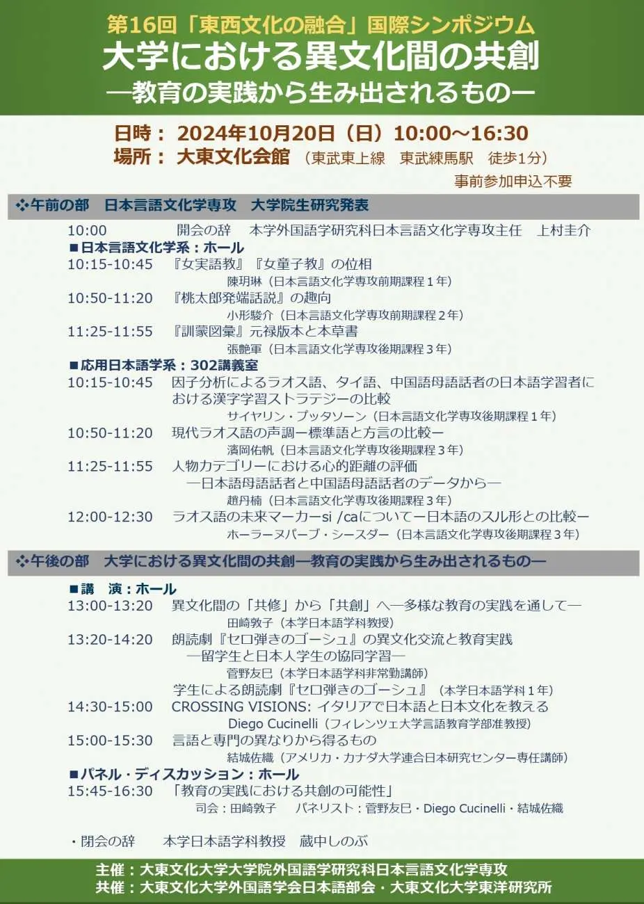 2024年10月20日(日)、本学大東文化会館にて、本学大学院外国語学研究科日本言語文化学専攻主催の第16回「東西文化の融合」国際シンポジウムが開催されます。