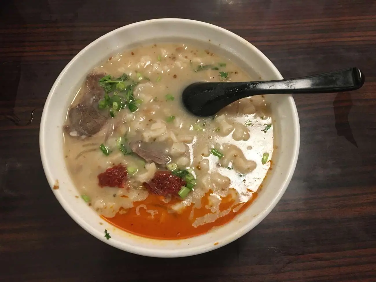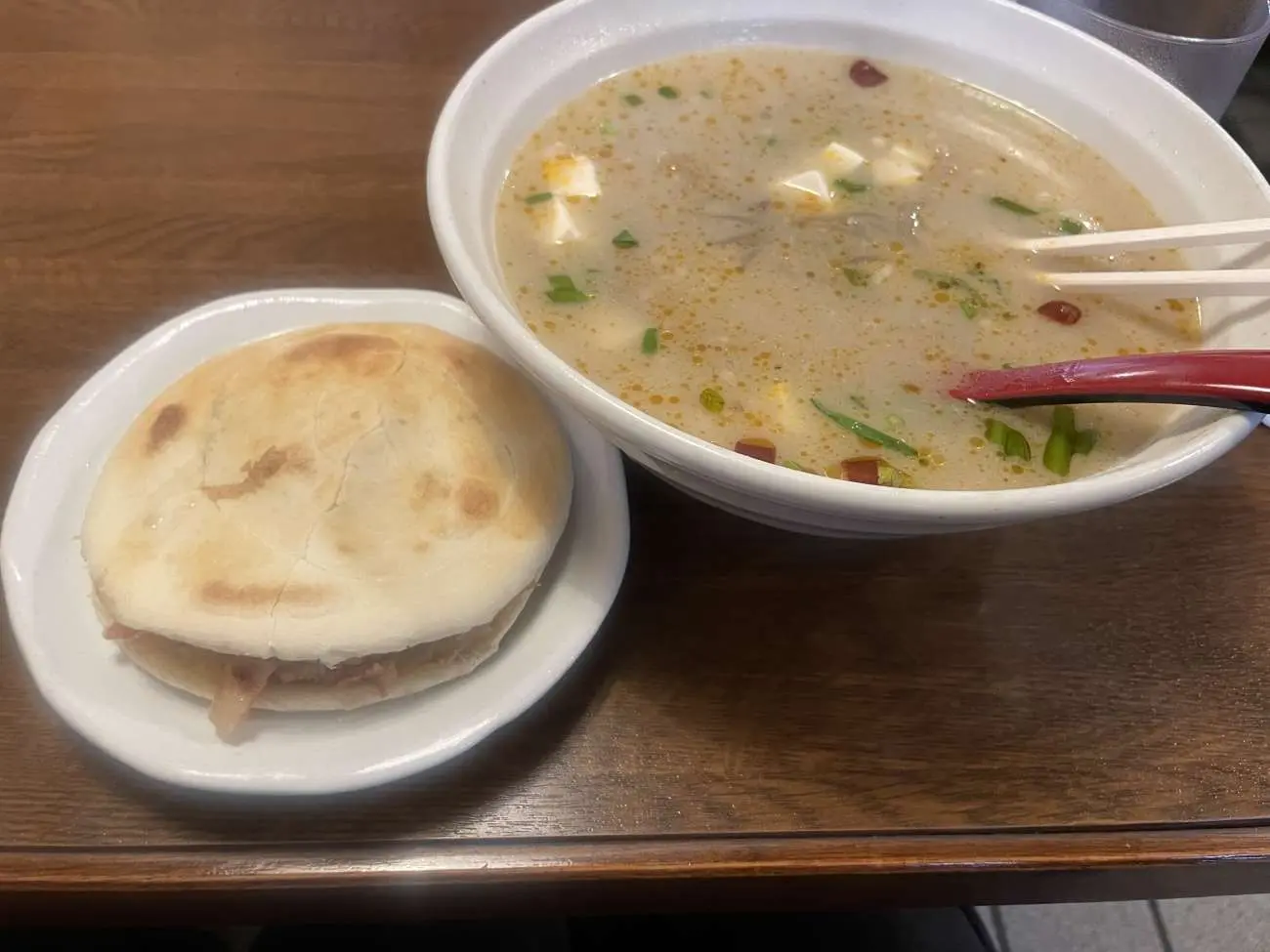 写真ではよく見えませんが、「饃(モー)」を切ってサイコロ状にしたものが中に入っています。主食にスープをかけて食べるわけですから、日本の「汁掛け飯」のようなものです。スプーンですくって食べます。