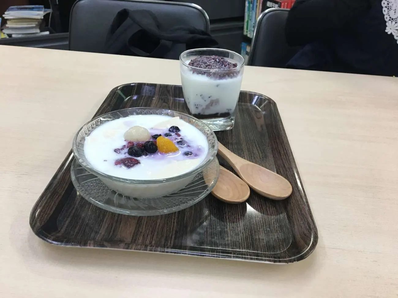 「水果冰豆花(フルーツ豆乳プリン)」と「熱奶宝(紫米おこわトッピングの小豆入りアイスクリーム)」