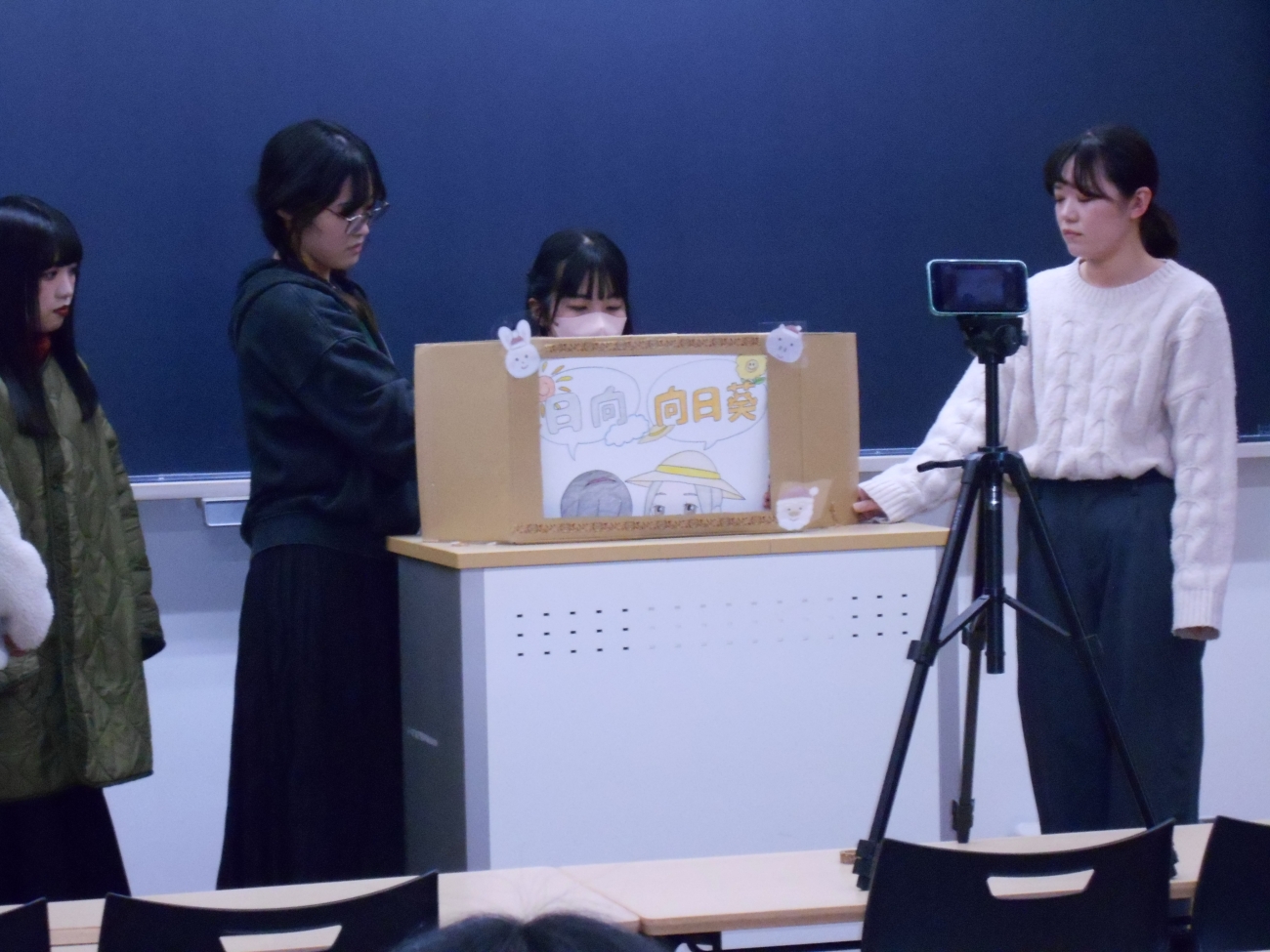中国語学科「中国社会文化演習1B」(通称山内ゼミ)の中国語による紙芝居の収録を12月15日(金)、予定通り行いました。「鶴が恩返しすることは知っている」と「向日葵」の2作品を収録し、字幕などを入れたものが完成しました。写真は当日の収録風景です。ご覧頂ければ幸いです。