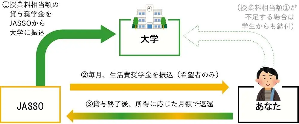 在学中は授業料を納付せず、卒業後の所得に応じて後払い(返還)していく制度です(採用後、日本学生支援機構(JASSO)から大学に直接振り込まれた授業料相当額の貸与奨学金が授業料に充てられるため、学生は入学手続き時等に授業料を納付する必要がありません)。