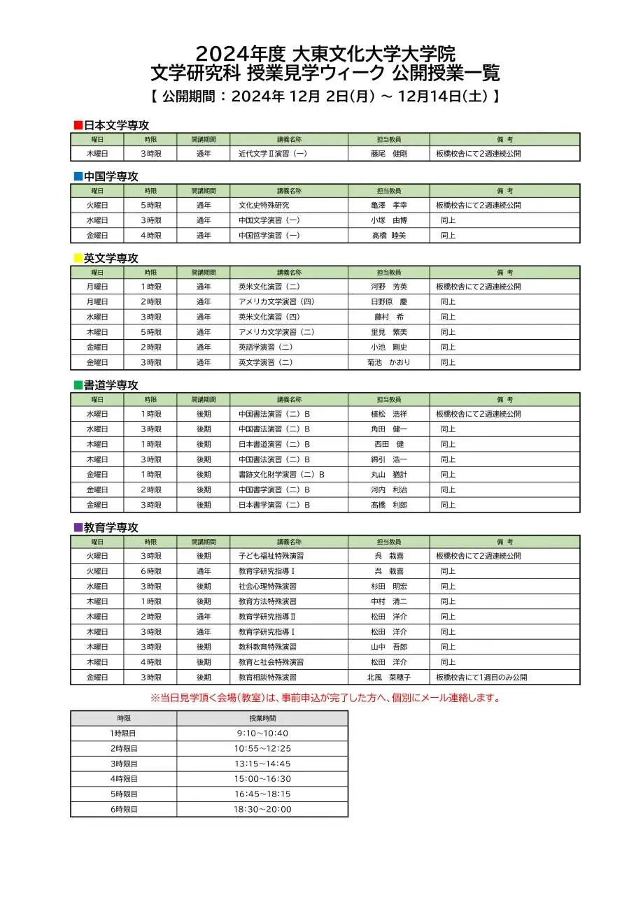 ■公開授業: 文学研究科5専攻の博士課程前期課程・修士課程の一部授業