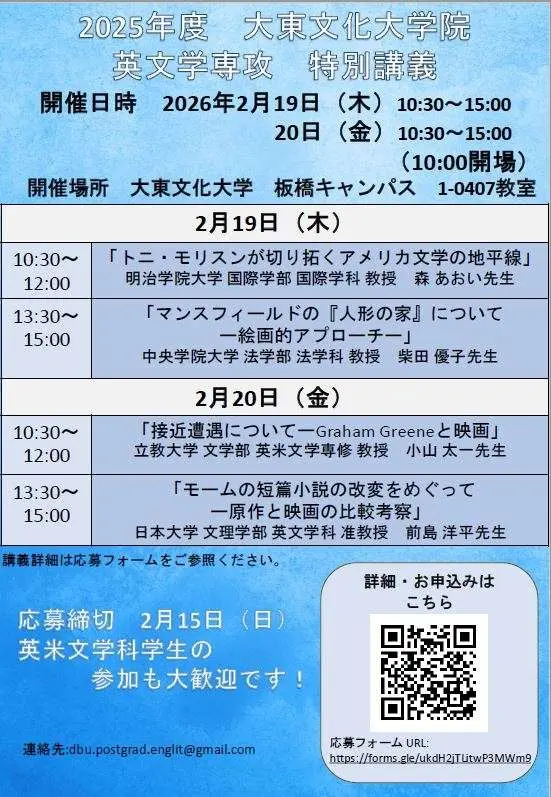 2025年度 ⼤東⽂化⼤学⼤学院 英⽂学専攻 特別講義を、2026年2⽉19⽇(⽊)・20⽇(⾦)に⼤東⽂化大学板橋キャンパスにて開催いたします。