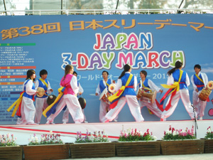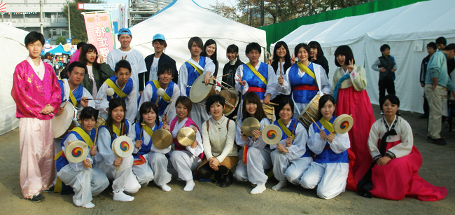 午後2時30分、中央会場も歩き終えたウォーカーでにわかに賑わってきました。ステージでは、民族資料研究班の「農楽」が実演されました。民族資料研究班は、顧問の飯國有佳子先生の指導の下、稲村悠典さんと五十嵐沙弥さんを中心に、この日のために、授業やアルバイトの合間を縫ってきびしい練習を重ねてきました。その甲斐あって、完歩した大勢のウォーカーの疲れを吹き飛ばすような、堂々とした躍動感のある「農楽」を演じきることができました。終了後には、実技指導をしてくださった民族音樂院の先生から「今までで一番よかった!」とお褒めの言葉も。来年は、ウェルカムパーティや最終日のパレードでも、さらに進化した「農楽」を見ることができるかもしれませんね。
