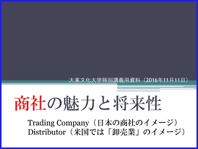 高橋社長は商社機能を三つに分類します。第1は、物流ビジネス=商社機能の「基本中の基本」であるマーケティング機能(モノを売る、情報力など)と「金融」と「ロジスティック」。第二の機能は「『モノ』を介さないビジネス」。グローバル経済に対応し、国境を越えて”Seeds”と”Needs”を結びつけるネットワーク機能や、委託加工や組立外注といった製造機能、そして、ベンチャー起業支援や海外展開支援等のコンサルティング機能がそれです。第三の機能は、Coordination機能や投資や「M&A」等の商社の枠を超えた機能。三井物産や三菱商事、外資系商社の大きな商社では、もはやこの種の機能が「花形部門」になっているそうです。