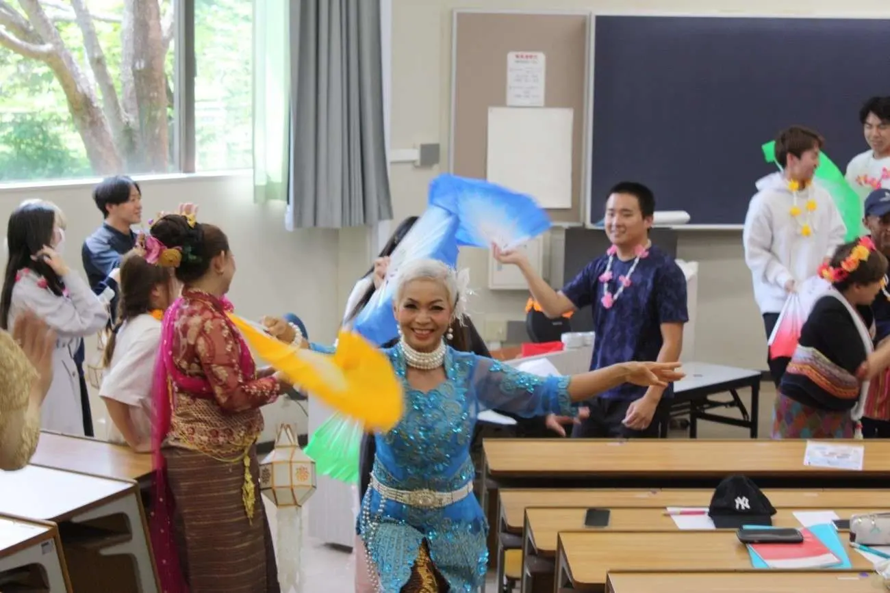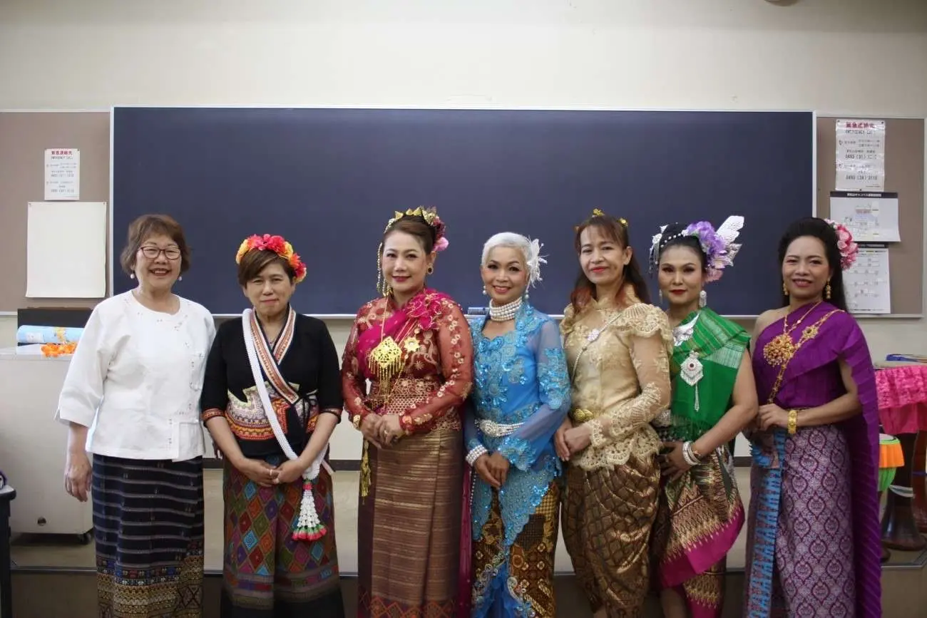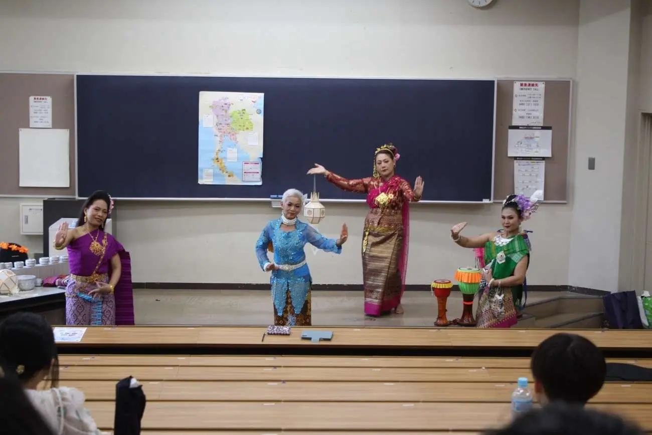 2024年5月22日の「国際協力・ボランティア入門」の授業において、埼玉在住タイ人クラブの方々によるタイの伝統舞踊の披露の後、学生たちへ舞踊や楽器などを教えて頂きました。