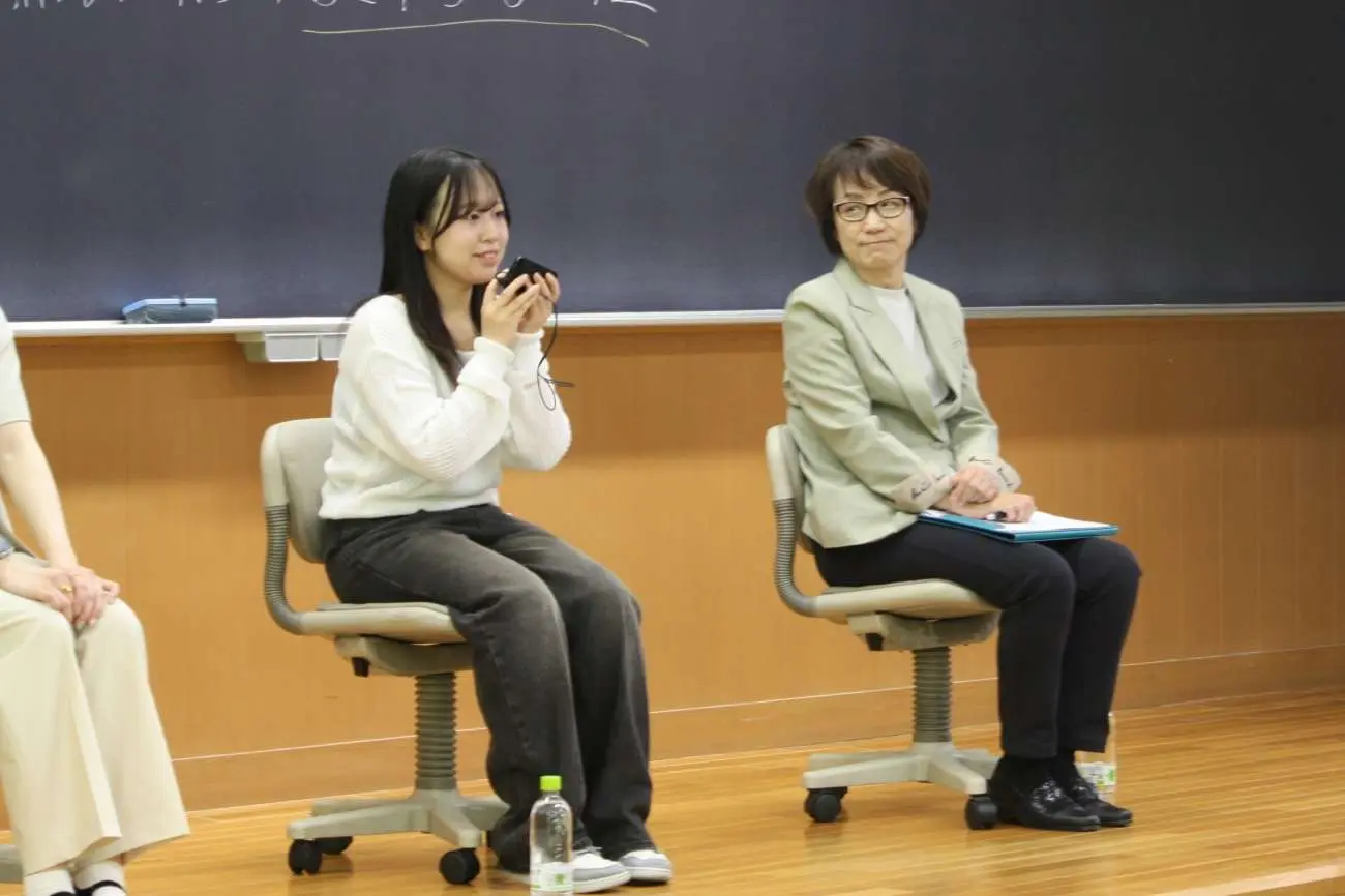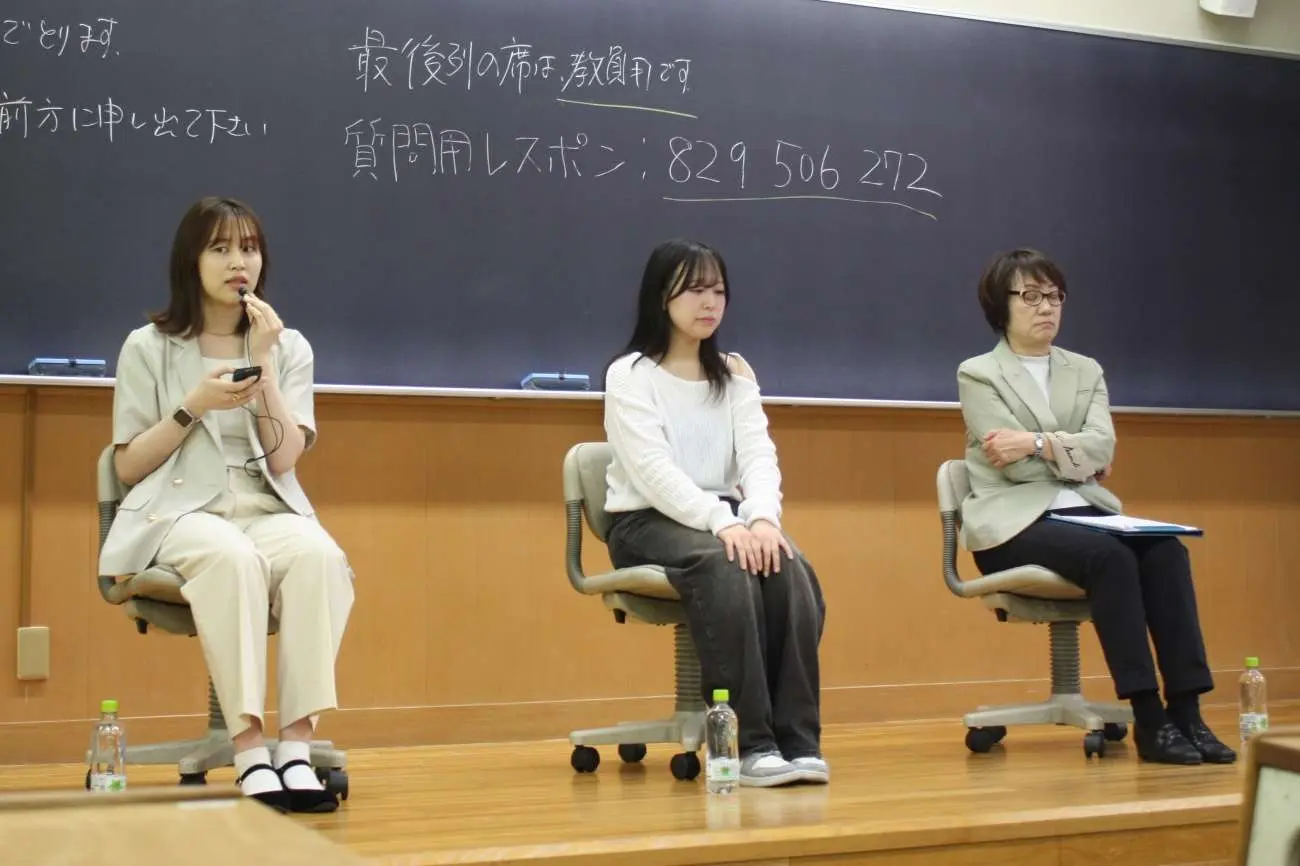 先輩からの体験談は、インタビュアーの細田先生からの質問によってさらに詳しく掘り下げられ、これから大学生活を充実させたいと思っている1年生の今の段階で知っておくべきことが、参考事例としていくつも紹介されました。