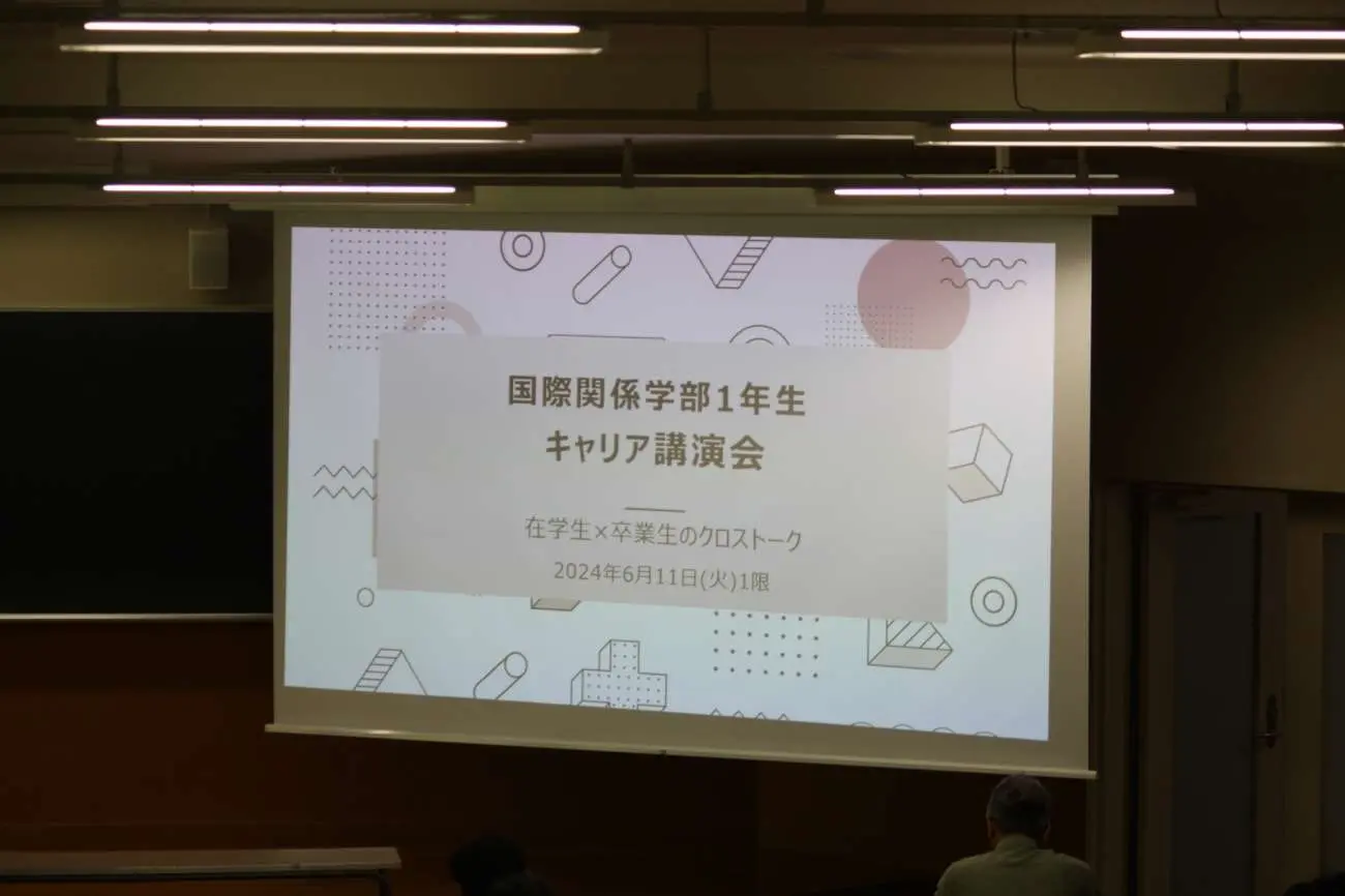 6月11日火曜日、11号館0201教室において2024年度キャリア講演会が開催されました。一年生向け科目であるチュートリアルの一環として開催されたこの講演会は、本学部の2023年度卒業生と在校生、(現3年生)一名ずつへのインタビュー形式で行われ、国際関係学部での学びを通じて、就職活動やその後の社会人としての人生を過ごすために今どのような行動や考えが必要なのかということを伝えるものとなりました。