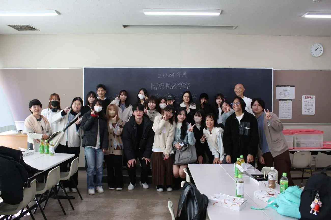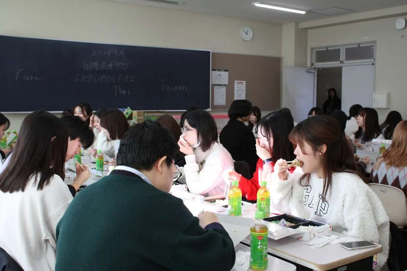 2024年12月10日、昼休みの時間に、交流学生(協定校からの留学生)と国際関係学部生の交流を深める昼食会が行われました。(5年ぶりの開催です。)今回のイベントには、韓国、台湾、タイからの交流学生をはじめ、学部生および学部の教職員約40名が参加しました。