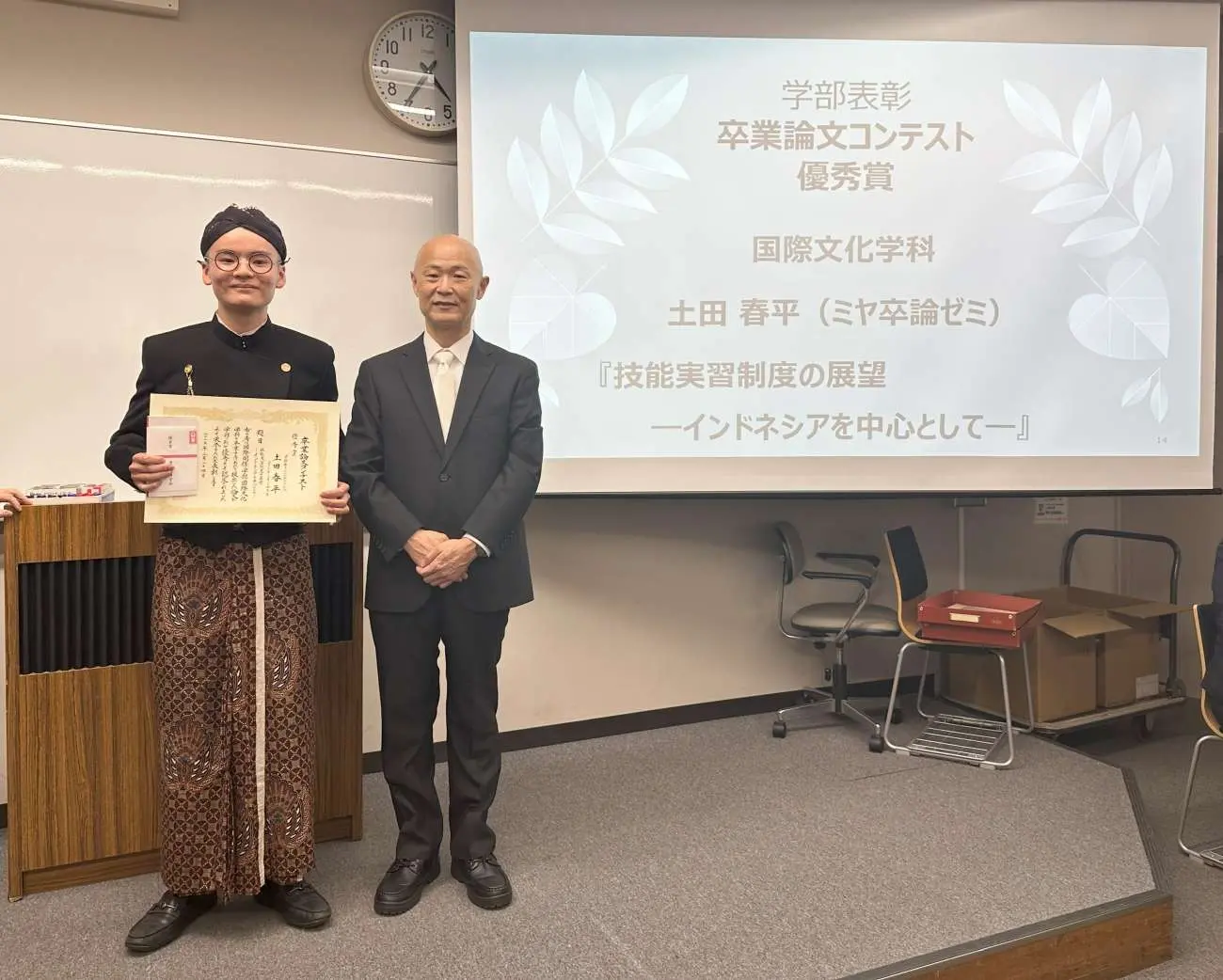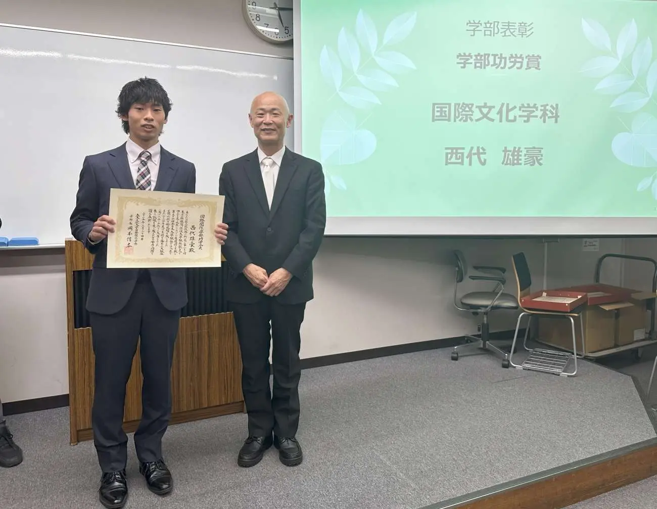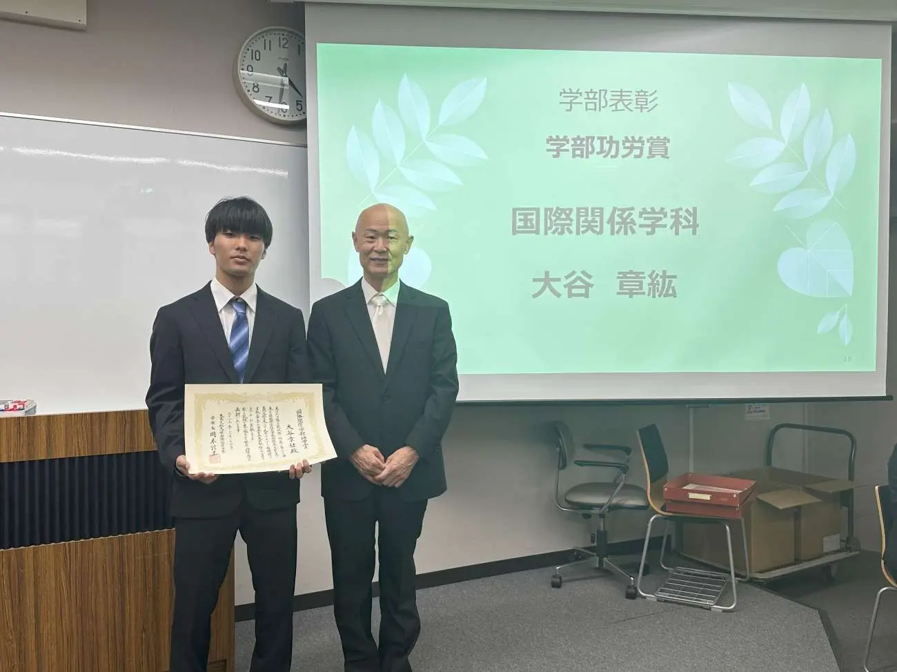 今年度は国際関係学部から、陸上競技部に所属する学生2名が学部功労賞を受賞しました。