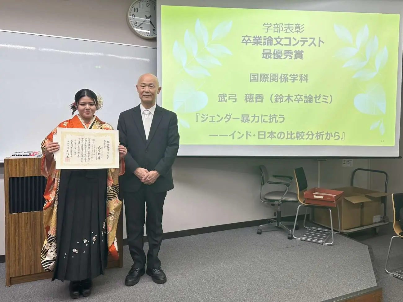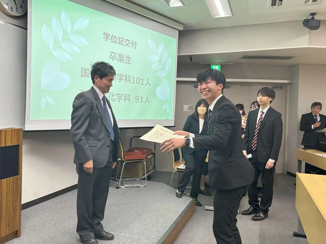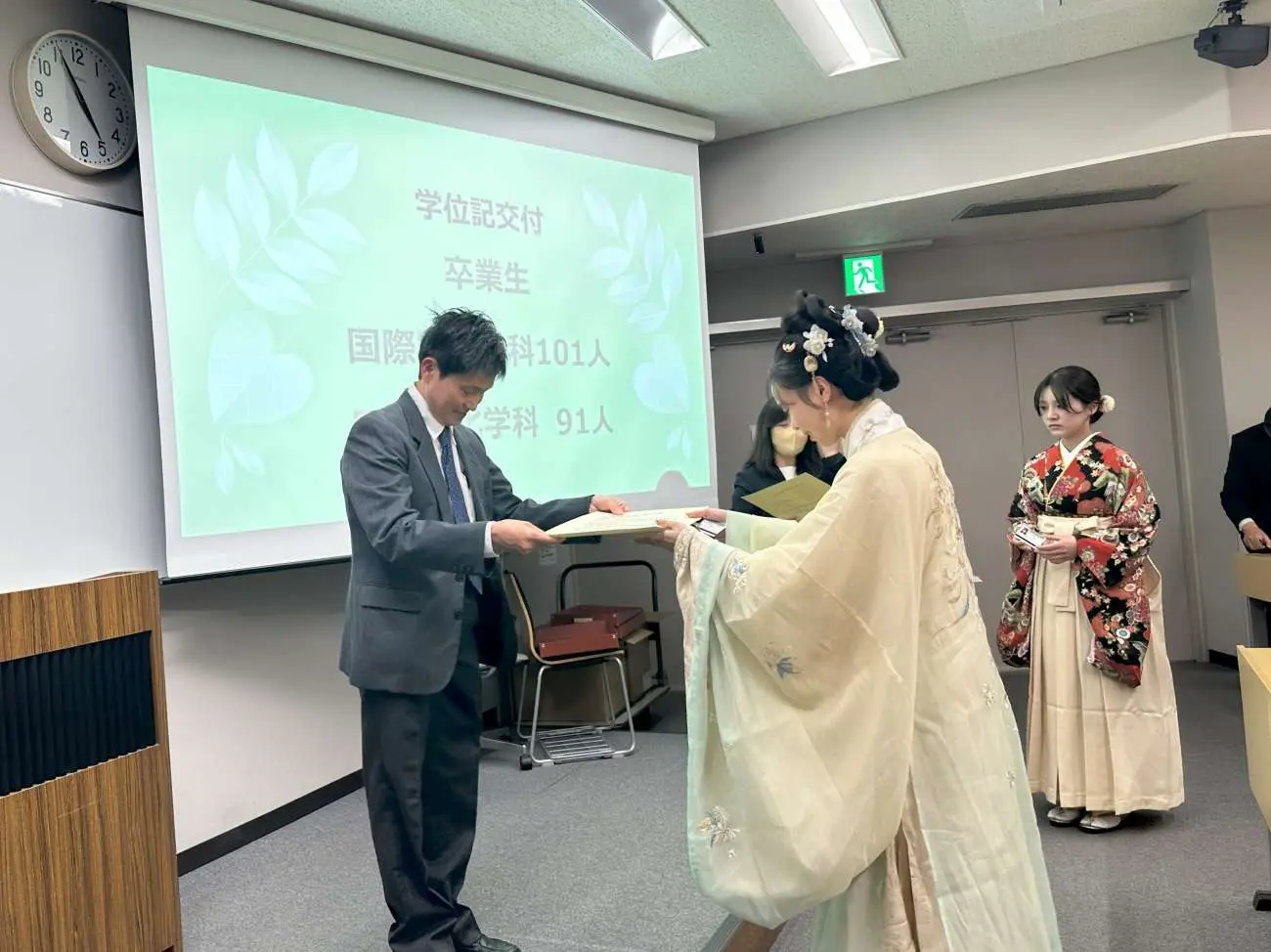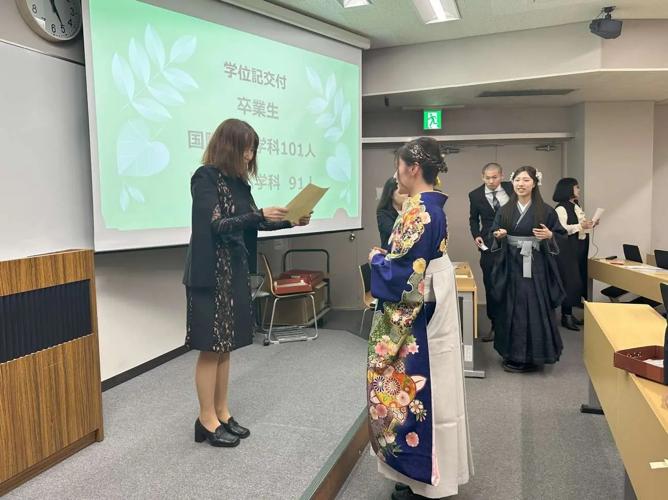 学位記授与は、遠藤元国際関係学科主任と井上貴子国際文化学科主任より卒業生一人一人に「おめでとうございます」の言葉と共に学位記が手渡されました。授与後には、先生や卒業生が記念撮影をする姿が見られました。