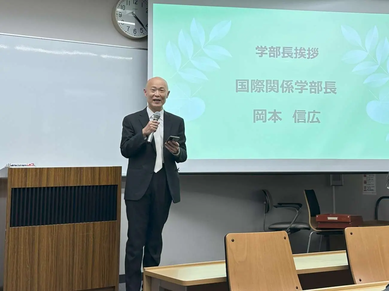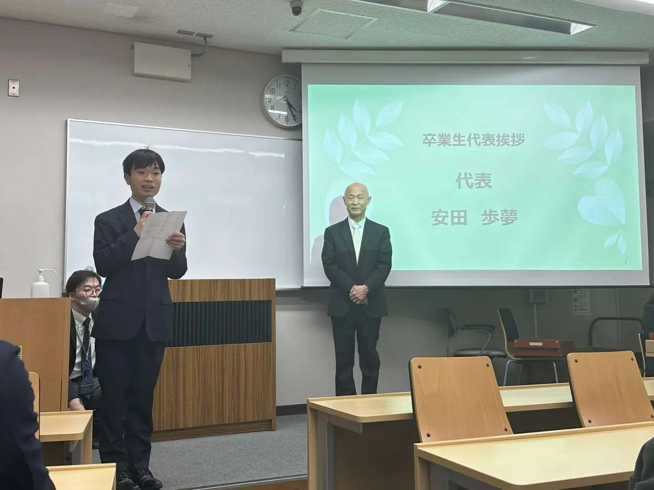 学部長の岡本信広先生から、卒業生へ向けての挨拶の後、国際関係学科 総代の安田歩夢さんによる卒業生代表挨拶がありました。