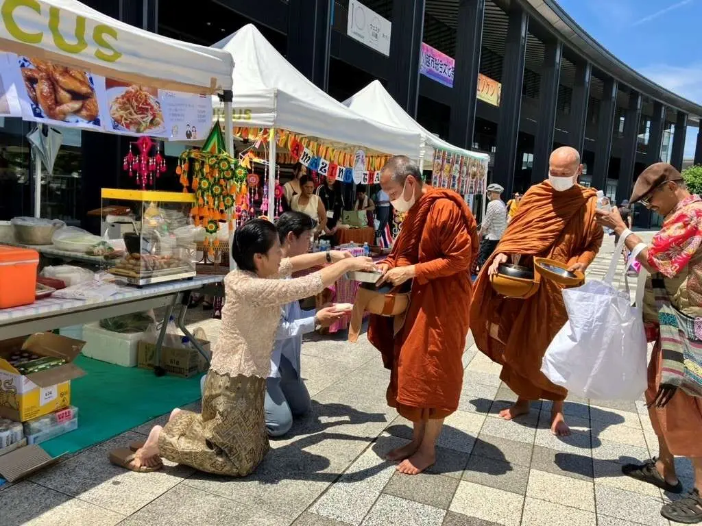 主催者からの要請を受け、国際関係学部『国際協力・ボランティア入門』を受講する学生たちを中心に、17名の学生がボランティアに参加しました。祭りではタイ料理のほか、タイマッサージやタイボクシング(ムエイタイ)体験コーナーや送金相談コーナーなども設けられました。また在日タイ人僧侶のブースも設置され、僧侶は昼前に托鉢を行ったり、在日タイ人の方々によるタンブン(布施)に対して読経を挙げるなどタイの精神文化も垣間見えました。学生たちは、多くの出会いや発見をしたようです。