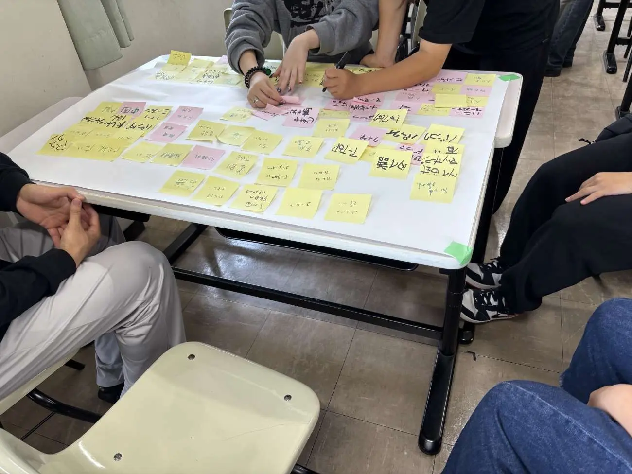 第2回、第3回は「アジア」をテーマにチームごとに連想する物を出し合い、アイデアを付箋に記入し、付箋をグルーピングして模造紙に貼り、発表するという作業を行いました。