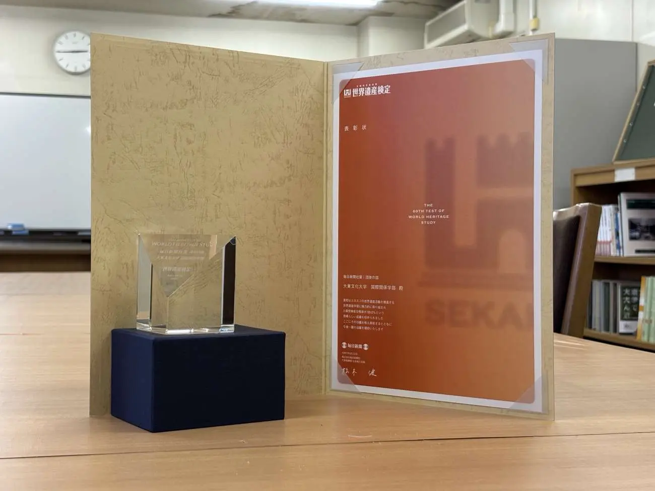 世界遺産検定事務局の高橋さんから岡本信広学部長に、賞状とクリスタル製のトロフィーが授与されました。