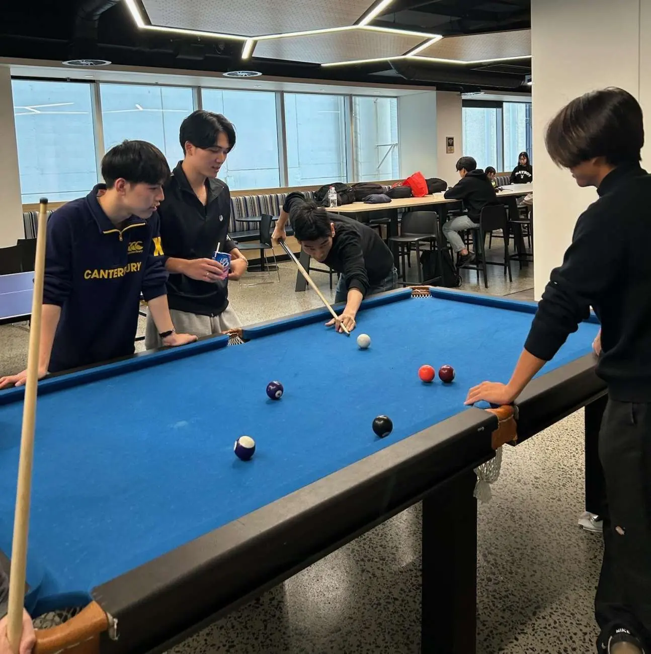 事前テストに基づいて6クラスに分かれて授業を受けました。クラスでは、他大学の日 本人学生や他国からの留学生と共に座学やプレゼンテーション、ゲーム形式を交えた授業が展開されました。休み時間では大学内にあるビリヤードや卓球を通じて現地の生徒とも 交流することができ、英語を積極的に話す機会になりました。