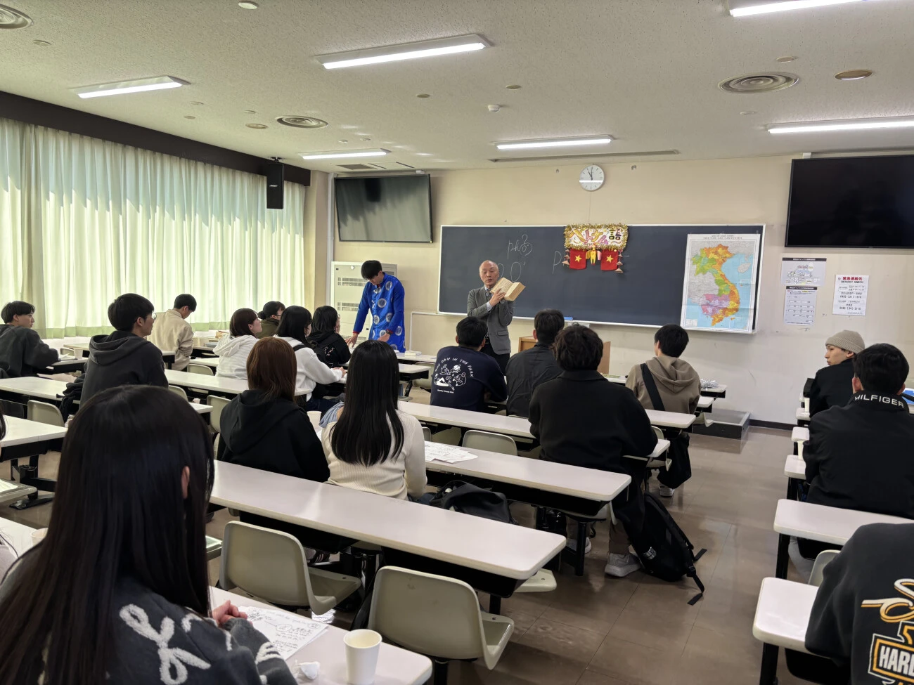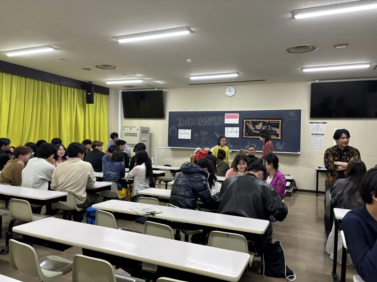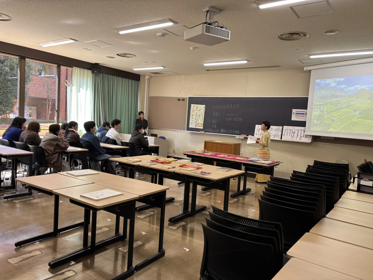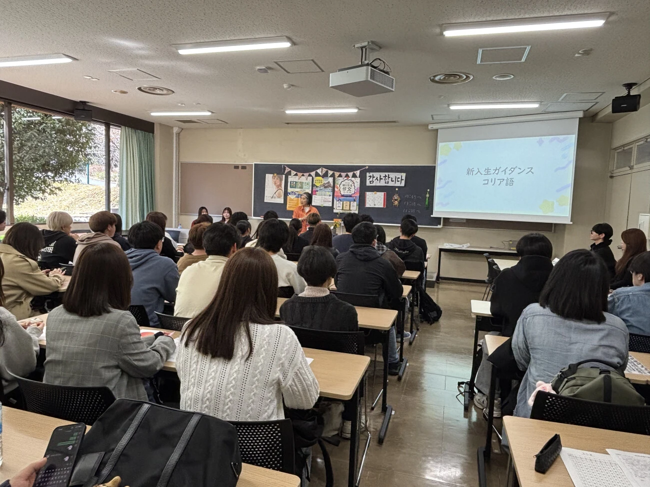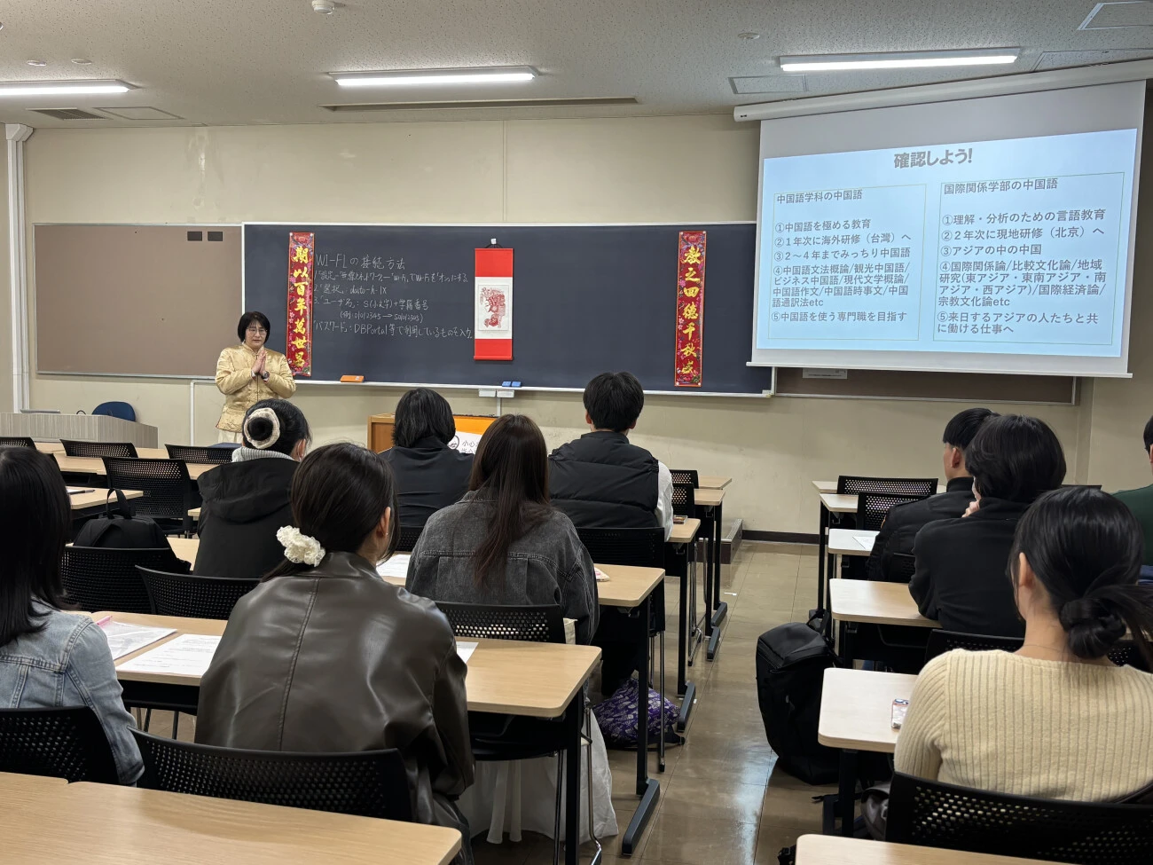 翌4月3日には、言語文化講座ガイダンスが行われました。最初に601教室で、地域言語教育委員会のミヤ・ドゥイ・ロスティカ准教授より、講座の概要について説明がありました。続いて、各言語の担当教員と、2・3年生の履修学生による言語紹介が行われ、それぞれの言語の魅力が紹介されました。その後、新入生は中国語、コリア語、ベトナム語、インドネシア語、タイ語、ヒンディー語、アラビア語、英語の各教室を自由に訪問し、全体説明では聞けなかった話を先生や上級生たちから直接聞くことで、言語選択の参考にしました。