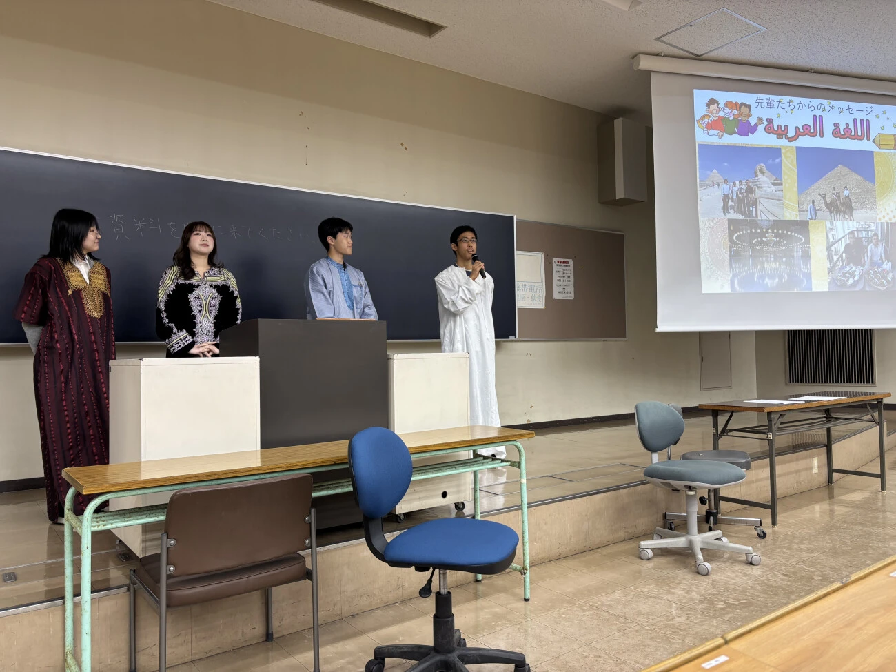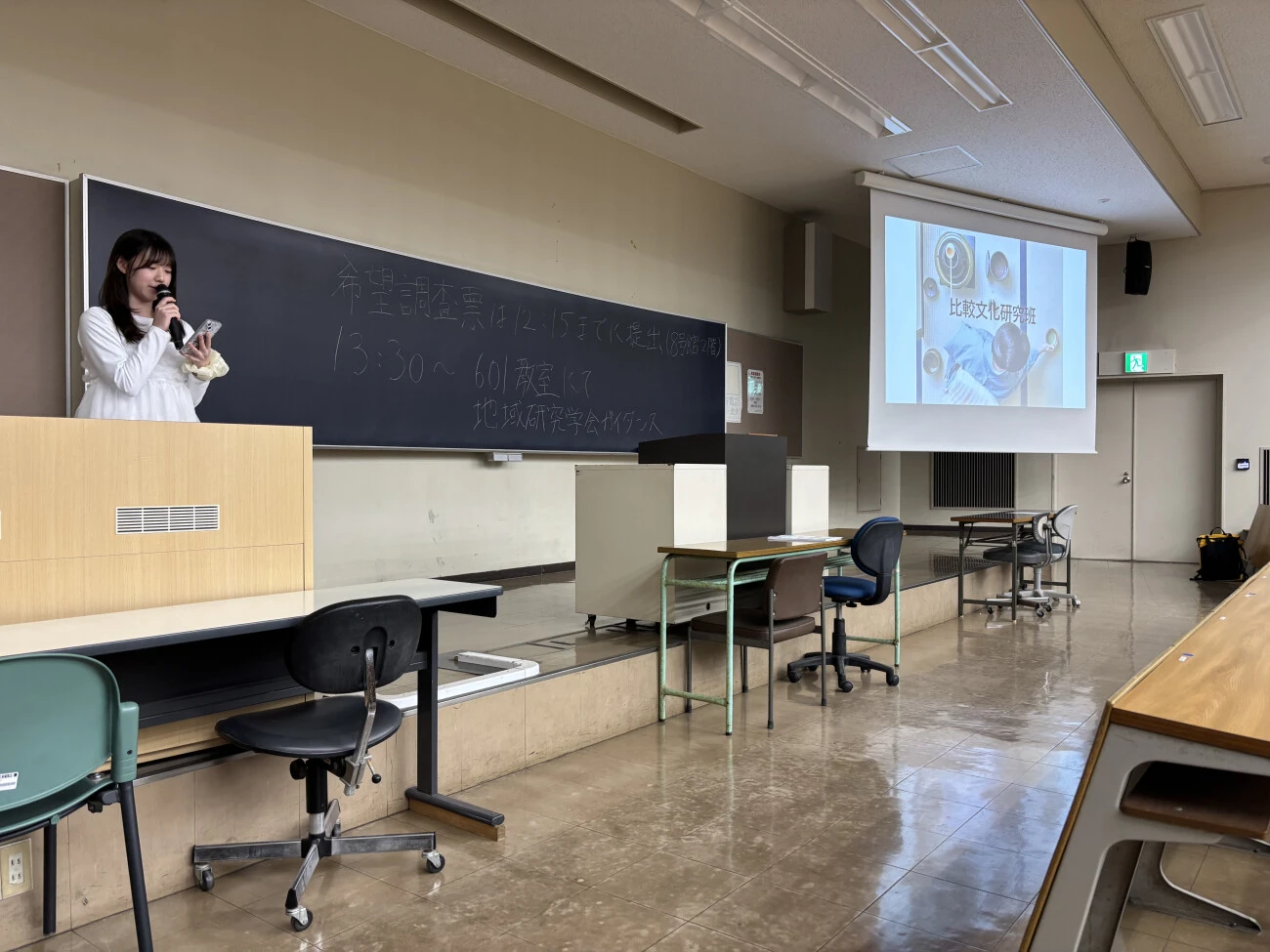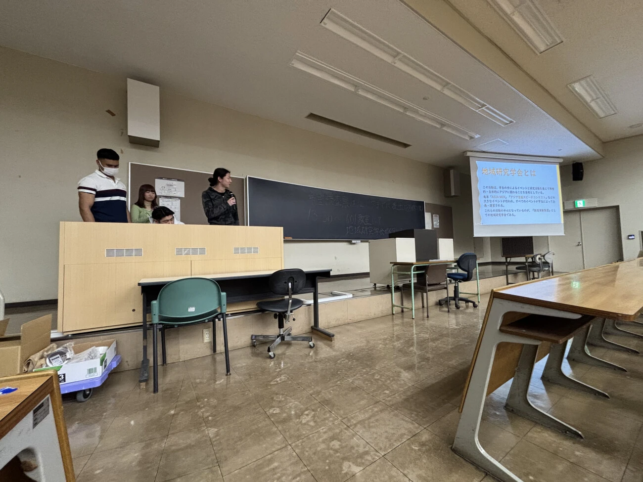 地域研究学会ガイダンスでは、上級生がPowerPointを用いて、地域研究学会や各研究班の活動内容を紹介しました。