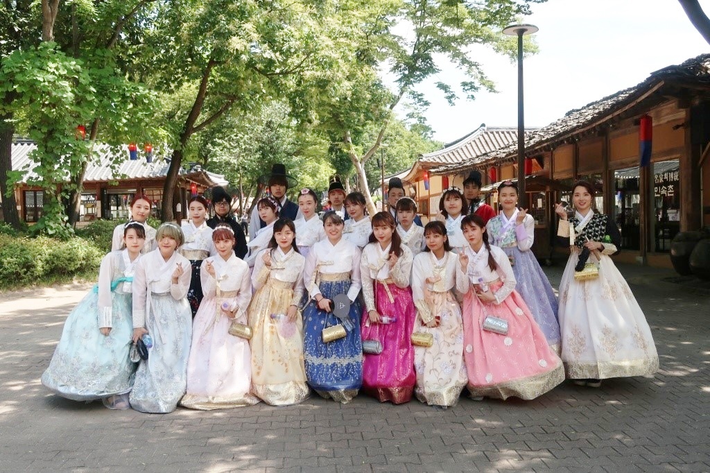 日曜日に全員で訪れた民族村では、それぞれが好きなデザインのチマチョゴリを選んで着ました。特に暑い日だったので、歩いているのも大変でしたが、普段なかなか着ることができないチマチョゴリを思う存分堪能しました。民族村には、韓国の歴史ドラマでも使用されたことのあるセットもあったので、ドラマの世界に浸りつつ韓国の文化や昔の暮らしぶりなどを味わうことができました。