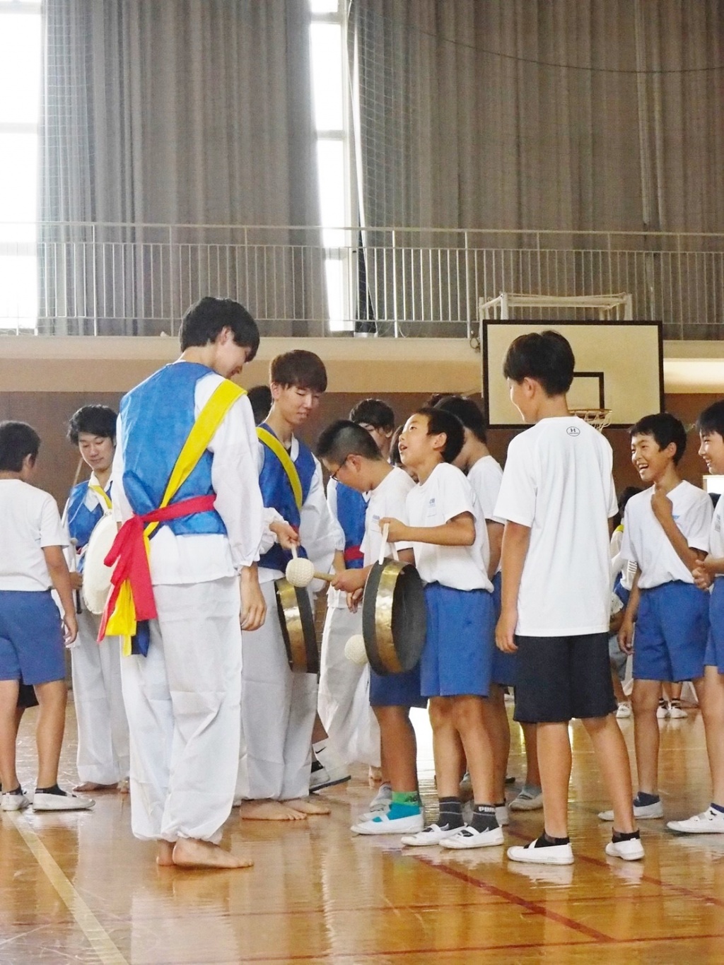 午前中の6年生の授業では、日本と歴史的、文化的に密接な関係を持つ韓国の言葉や文化についての体験学習を行いました。準備したレジュメを見ながら、韓国と日本の似ているところと違うところについて説明をした後、韓国の伝統音楽である農楽を演奏しました。