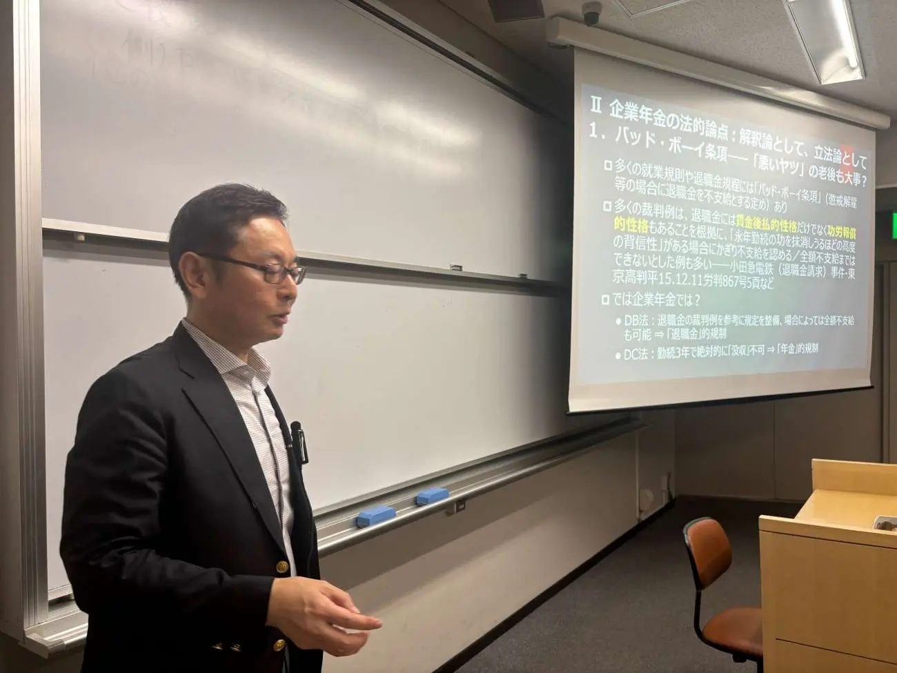 企業年金とは一体何か、その性質をどのように捉えるべきか、また労働法などとの関係で如何なる問題点が存在するかにつき、森戸教授らしくユーモア溢れる語り口で論じられた。