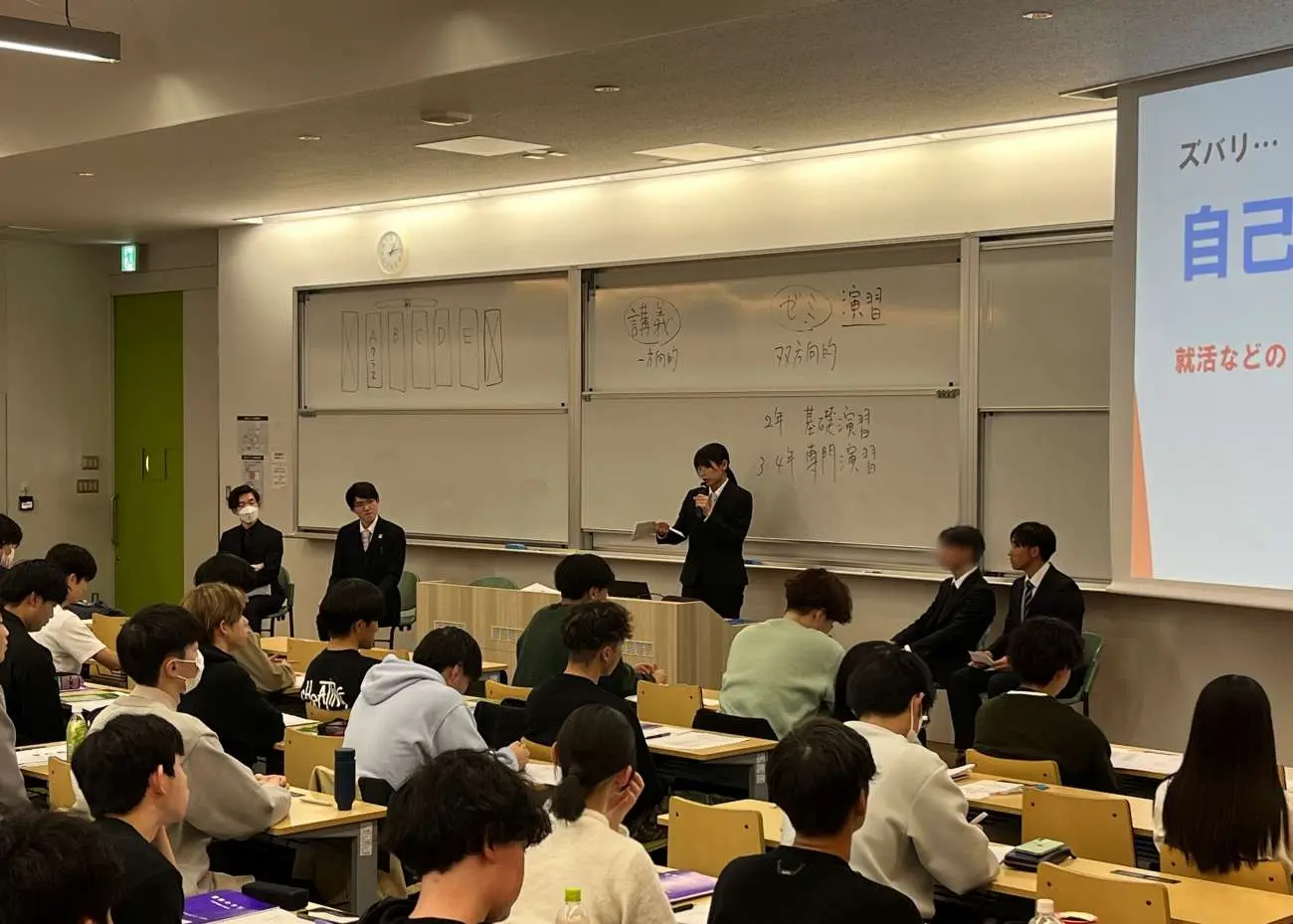 アシスタント学生によるパートでは、先輩学生によるスピーチが行われました(写真①)。