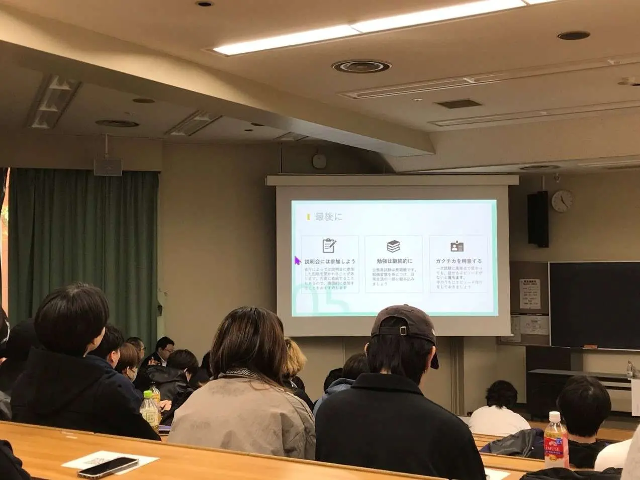 また、講演に先立ち、キャリアセンターの担当者から、昨今の就職状況や、どのような人が大手企業に内定しているか等の情報提供がありました。