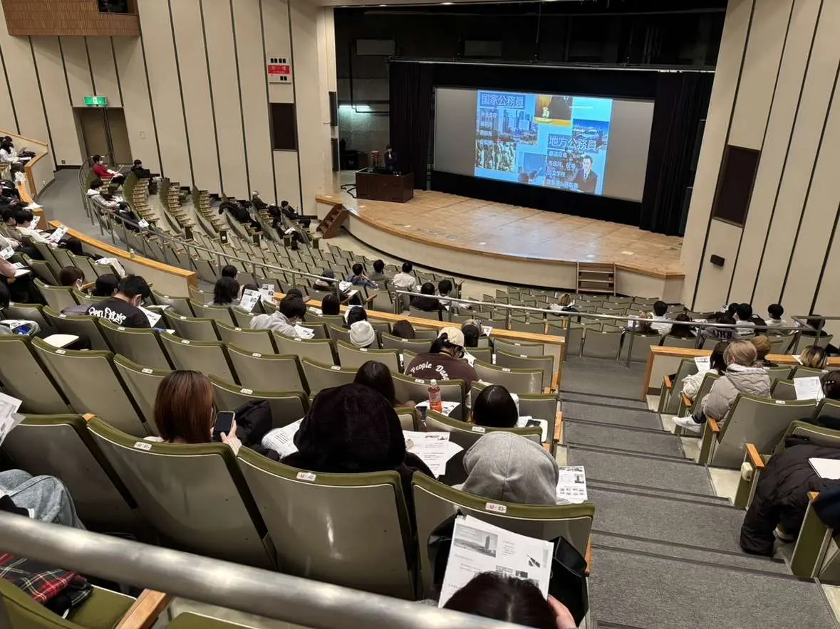 2025年12月12日(金)の2限に、法律学科1年生を対象とするキャリア支援講演会が開催されました。講師の先生は群馬県庁職員の穂坂一浩さんで、「地方公務員の仕事~県職員の魅力とは~」という題目で講演をしていただきました。講演では県庁の組織や仕事内容の紹介や、国、市町村と比較した都道府県行政の位置付け、群馬県庁職員が実際にどのように働いているのかをお聞きすることができました。また、穂坂さん自身の大学生時代の経験や就職活動で心がけたこと、就職をしてから県職員になるまでの経緯など、大変参考になるお話もありました。講演会の合間には群馬県に関するクイズも出題され、参加した学生も飽きることなく熱心に講演に聞き入っていました。講演には100名を超える多数の1年生が参加しました。