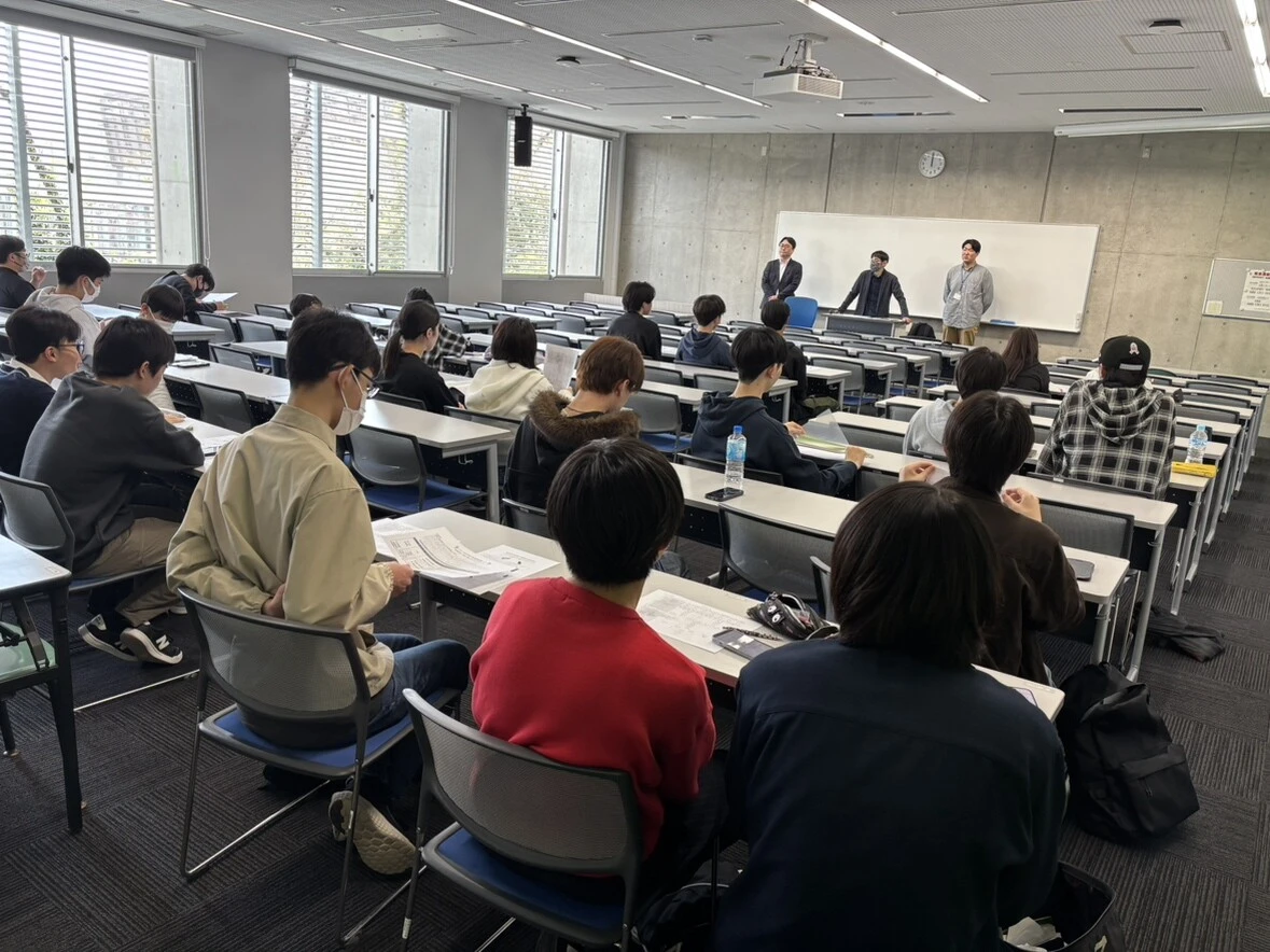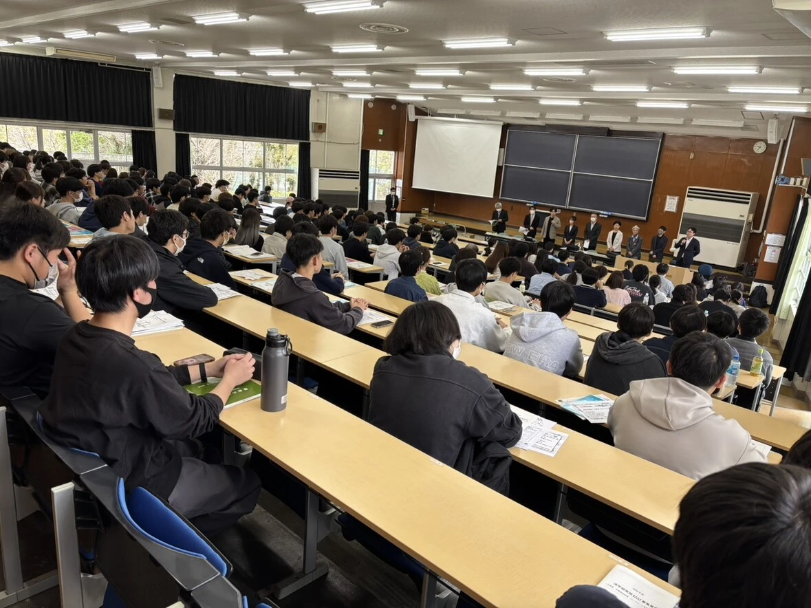 2026年4月6日、法律学科新入生セミナーが開催されました。同セミナーは法律学科新1年生全員を対象とし、法律学科に関するさまざまな案内や履修ガイダンスを目的としています。セミナーは二部構成で、新1年生全員を対象とする全体会と、各クラスに分かれての分科会からなります。