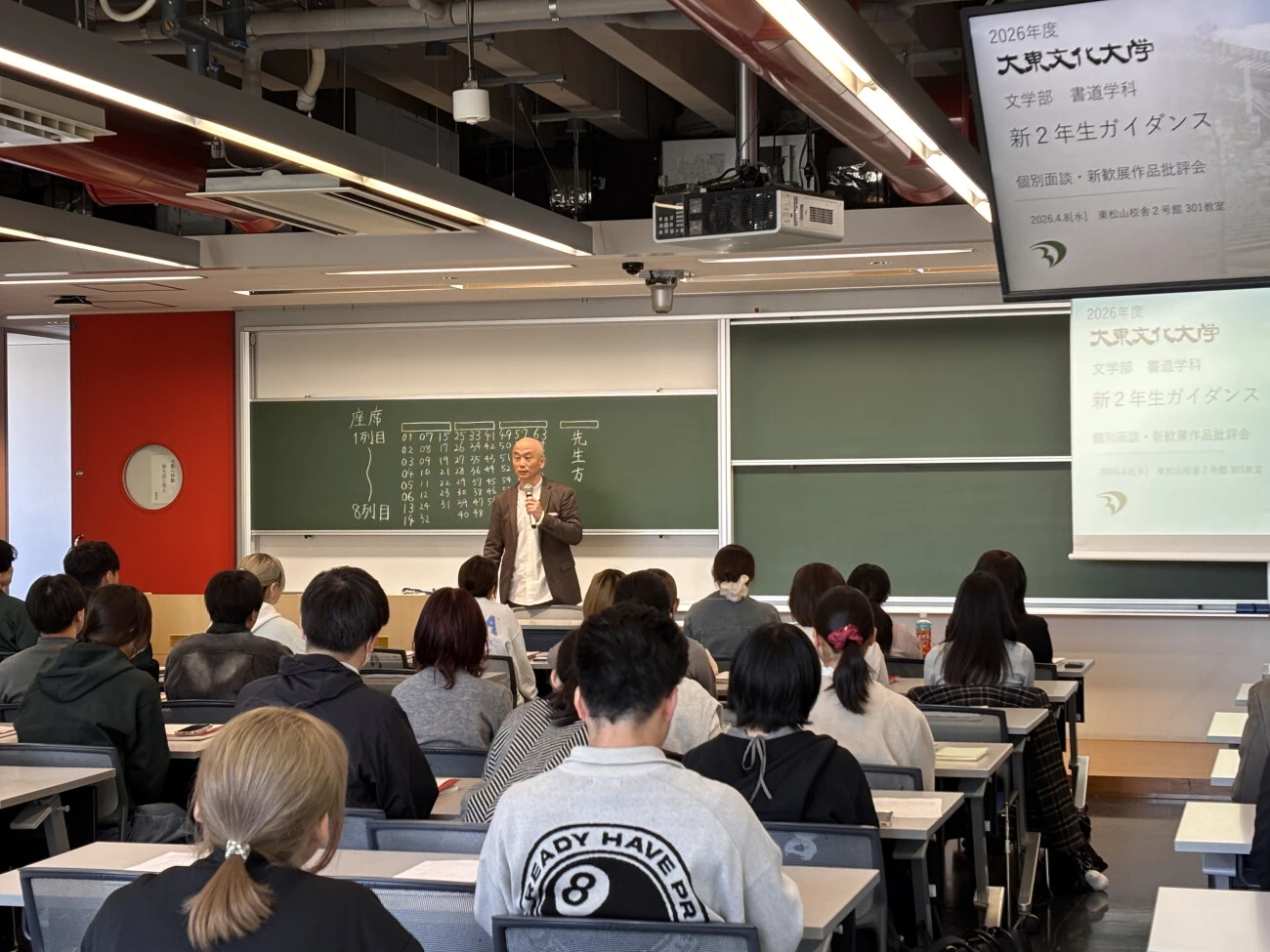 4月8日(水)、東松山校舎4号館・2号館301教室・アトリエにて、書道学科新2年生ガイダンスを実施しました。