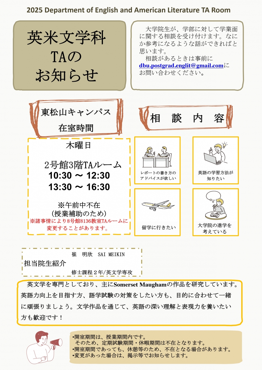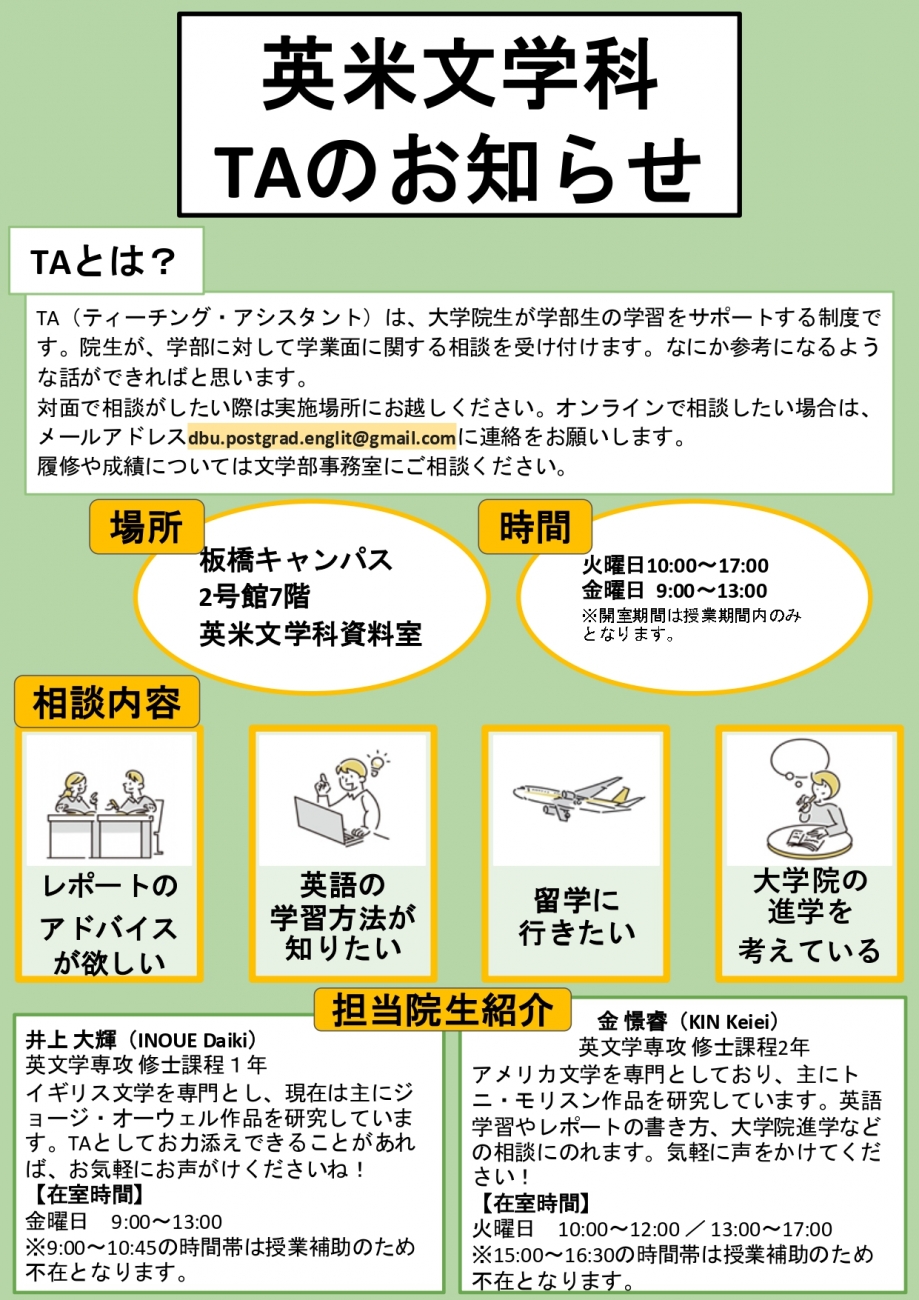 大学院生が学部生の学習をサポートするTA(Teaching Assistant)のご案内です。大学院生が、学業面に関する相談を受け付けます。留学、レポートの書き方、授業での発表の仕方、英語学習法、資料の探し方など、気軽に相談してみてください。相談がある場合は、該当キャンパスの在室時間を確認してください。相談をお待ちしております。