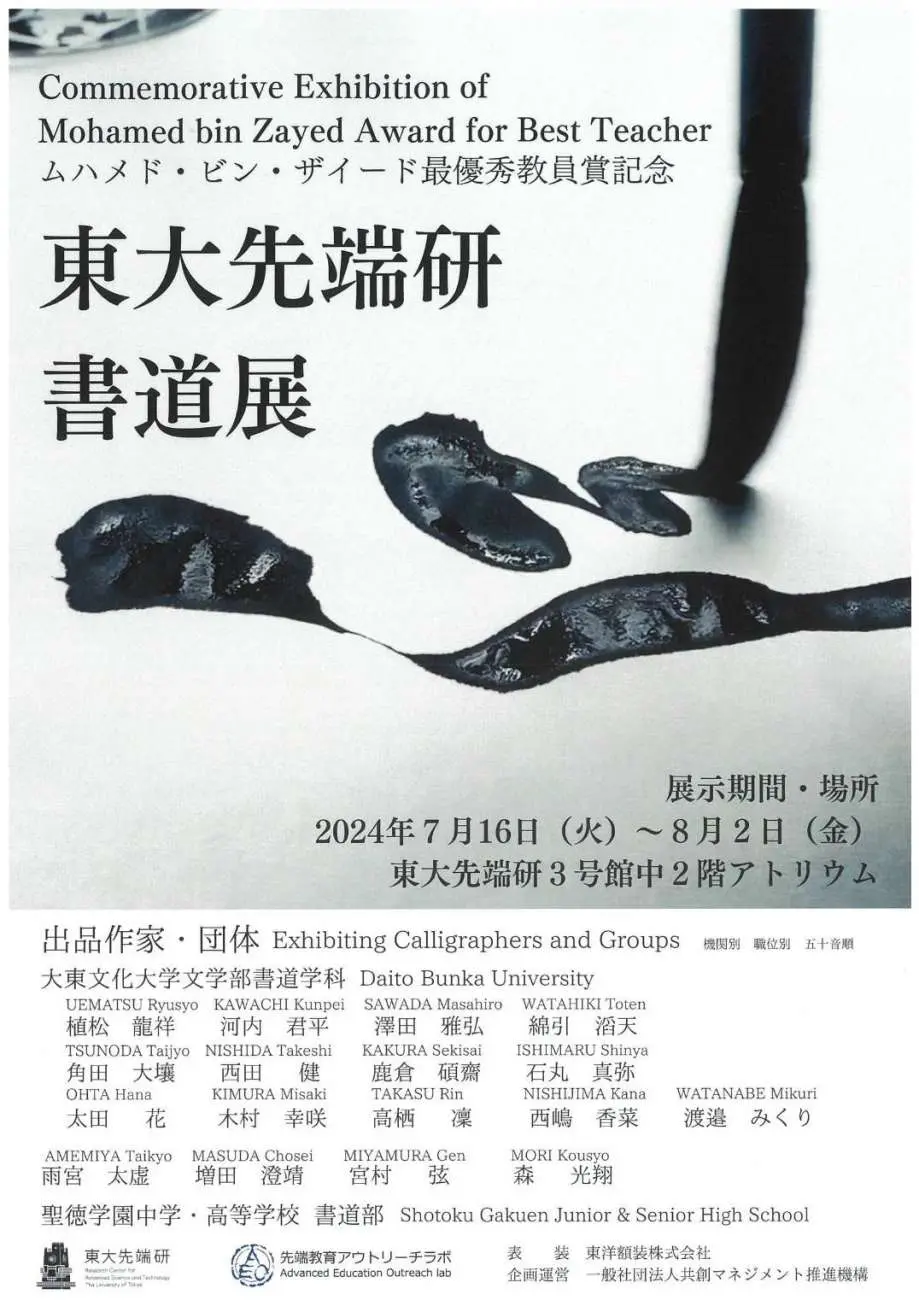 2024年7月16日(火)~8月2日(金)、東京大学の先端研3号館中2階アトリウムで、森晶子先生〈東京大学先端科学技術研究センター 先端教育アウトリーチラボ(AEO)ディレクター/特任助教〉プロデュースのもと、「東大先端研書道展」が開催されました。下記の開催趣旨に賛同し、大東文化大学文学部書道学科の専任教員、各書作ゼミ代表者の作品も展示されました。
