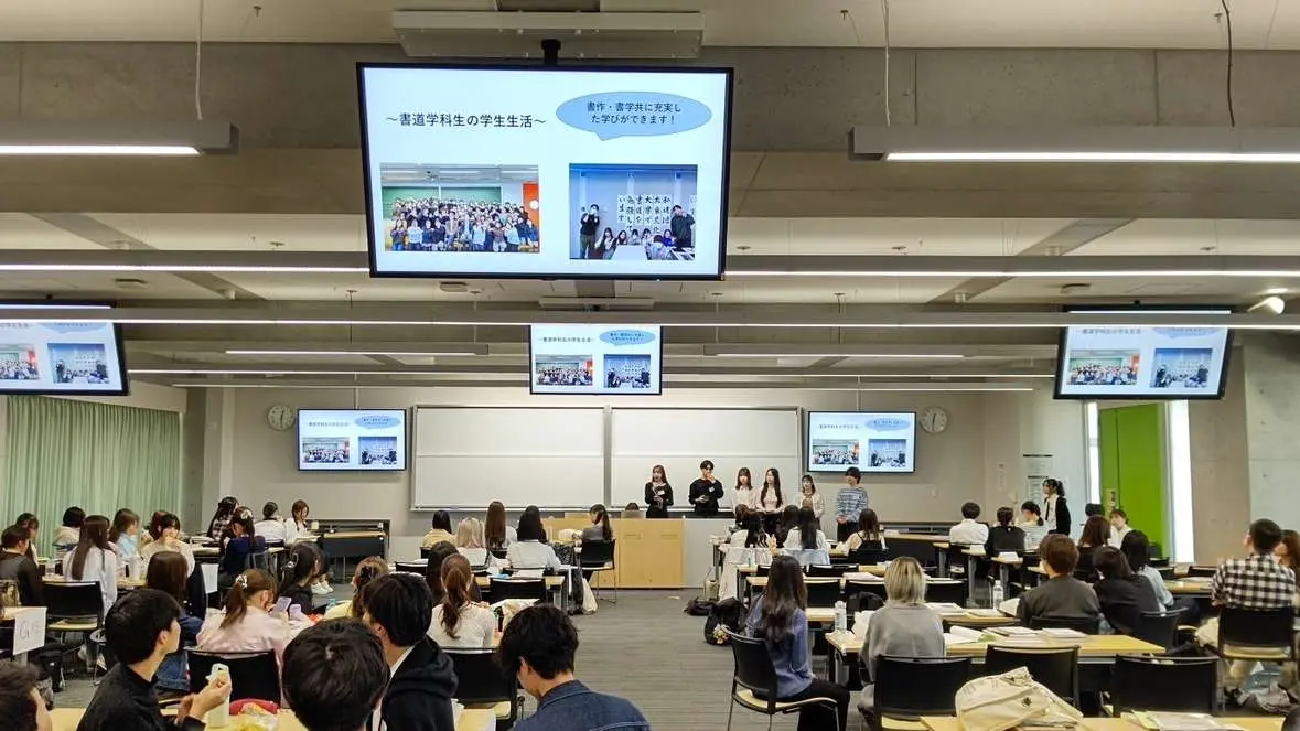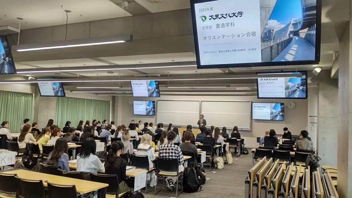 2025年度、書道学科は68人の新入生を迎え、4月19日、新入生オリエンテーション合宿(日帰り)を東松山校舎にて開催しました。昨年まで長い間、武蔵嵐山にある国立女性教育会館(ヌエック)にて開催しておりましたが、施設閉鎖に伴い、今年度は東松山校舎にて日帰りでの実施となりました。