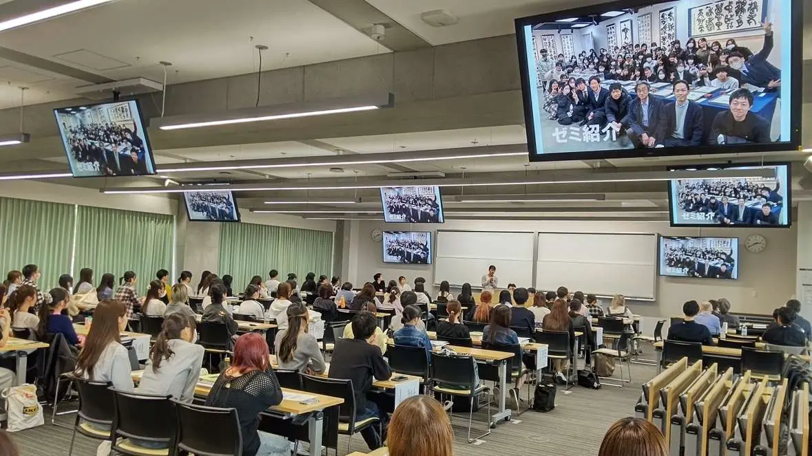 綿引主任のご挨拶から始まり、教員の自己紹介、書道学会、書道研究所、刊行物、教職、留学、進路、大学院についての説明、集合写真撮影、2年生オリターによる学生生活紹介、新入生の自己紹介、3・4年生によるゼミ紹介(各ゼミ、ゼミ展、卒展)、記者会見・質問タイム(上級生に大学生活等の質問や相談)、学年委員(オリター)候補選出、席書会(寄せ書き)、を行いました。新入生の自己紹介では、クラス担任の進行のもと、趣味や特技、地元の良いところなどを紹介しました。照れながらも一生懸命な姿がとても初々しかったです。記者会見・質問タイムも昨年同様、大いに盛り上がりました。席書会では、西田先生・藤森先生の揮毫に対する新入生の眼差しが熱く、各々の氏名を書く姿も今の意気込みを強く感じるものでした。(※この寄せ書きは、4年次の学位記授与式の際に展示しています。)