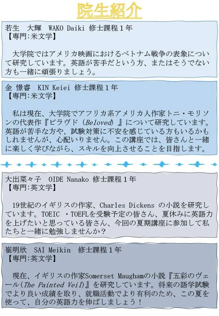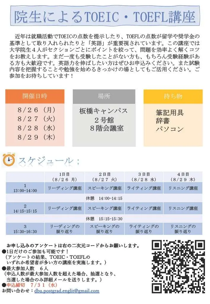 英米文学科の学生の方々に向けて「院生によるTOEIC・TOEFL講座」を開催します。