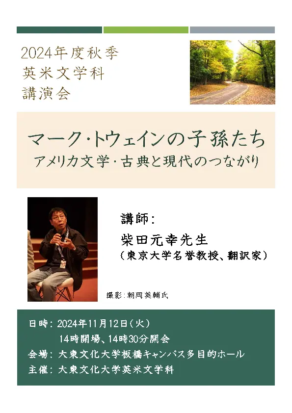 第一部では、東京大学名誉教授の柴田元幸生が、「マーク・トウェインの子孫たち アメリカ文学・古典と現代のつながり」という題でご講演くださいます。なお、詳細は添付資料「2024年度秋季英米文学科講演会のお知らせ」およびポスターをご確認ください。