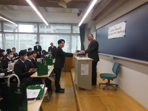 その後、板橋キャンパスに移動し、学部学科ごとに卒業証書授与式がありました。歴史文化学科は卒業生90名に対し、まず武藤学科主任の祝辞、青桐賞と方俊植賞の表彰があり、その後武藤先生から各ゼミの代表者に卒業証書が渡された後、代表者それぞれが4年間の大学生活の想い出を語りました。この学年は、入学直後はコロナ禍の影響で遠隔授業から始まり、大変な思いをしましたが、徐々に対面の授業も始まりゼミの実習を行うこともできました。その後ゼミの指導教員から一人一人に卒業証書が渡され、ゼミごとに写真を撮り、最後は学生と教員が全員一緒に写真を撮り終了となりました。終了後も多くの学生が別れを惜しみ、学生同士、学生と先生方が遅くまで語らっていました。