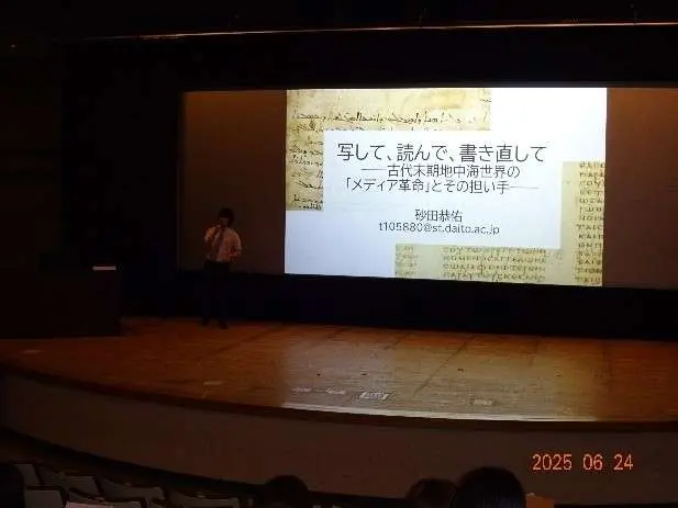 第2部は、本学科の研究補助員で非常勤講師をつとめる砂田恭佑先生による、「写して、読んで、書き直して―古代末期地中海世界の『メディア革命』とその担い手―」という題の講演でした。古代はパピルスに大文字によって書かれた巻子本であったものが、やがて「メディア革命」により冊子本へと変化を遂げていったのですが、その間にはキリスト教の修道士など、キリスト教に関係する人々による数多くの「写す」、「書き直す」という行為があり、その作業は膨大で非常に手間のかかる行為であったわけですが、書物や文献は、そのような行為によって伝わり、おのずと残っていくものではないということでした。また、古代末期の地中海地域は、古代の文献を受け継ぎつつ「メディア革命」をはじめとした独自の文化変容の舞台となり、その後の世界に大きな影響を与えた地域であったことがわかりました。