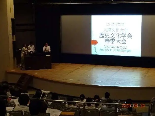 6月24日(火)に東松山キャンパス60周年記念講堂で、2025年度の歴史文化学会春季大会が行われました。歴史文化学会会長の武藤慎一教授の開会のことばで始まり、第1部は、「西郷隆盛の実像を追って―肖像画と同時代の証言から―」と題し、本学歴史文化学科2年生の赤池晴佳さん、大石美優さん、高橋啓太さん、トムス咲那さんのグループによる発表がありました。西郷隆盛の実像を、肖像画と同時代の証言から考察した内容でしたが、西郷の妻が上野の西郷像の除幕式で「こげな人じゃなか」と発言し、それは顔が似ていないのではなく、着流しのような格好で出かけるようなことはない、という意味であったらしく、政府に反抗した西郷の神格化を恐れたためではないか、という分析が興味深い内容で、西郷の実像に迫るために、多くの証言を丁寧に集めていたのが印象的でした。