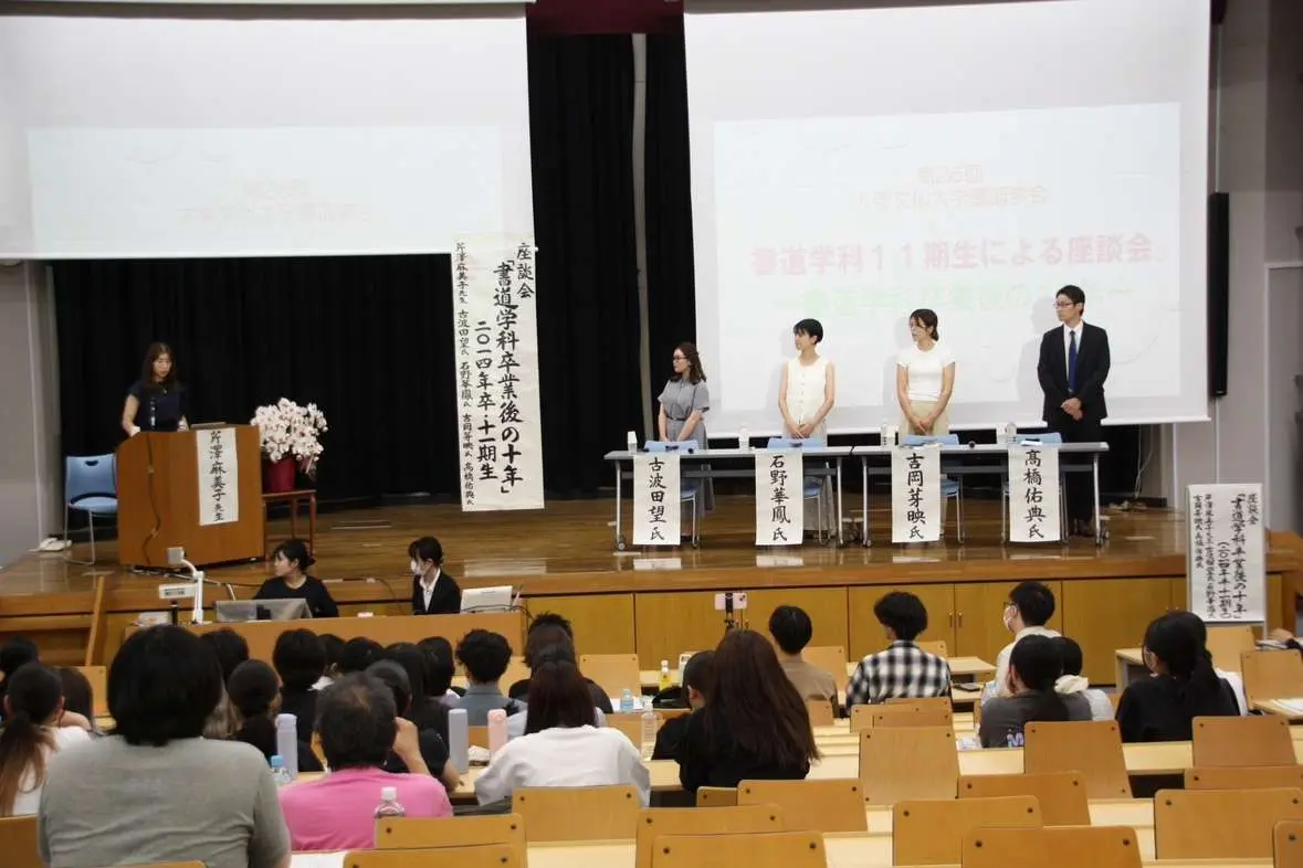 大会では、書道学科11期生(2014年卒)による座談会「書道学科卒業後の十年」が行われ、芹澤麻美子先生(本学非常勤講師)を司会に、パネリスト(古波田 望氏・石野華鳳氏・吉岡芽映氏・髙橋佑典氏)の皆さんから卒業後の仕事内容や書とどのように向き合ってきたかについてお話いただきました。学生達は、今後のキャリア形成を考える一つの指針になることもあり、先輩方の話に耳を傾けていました。