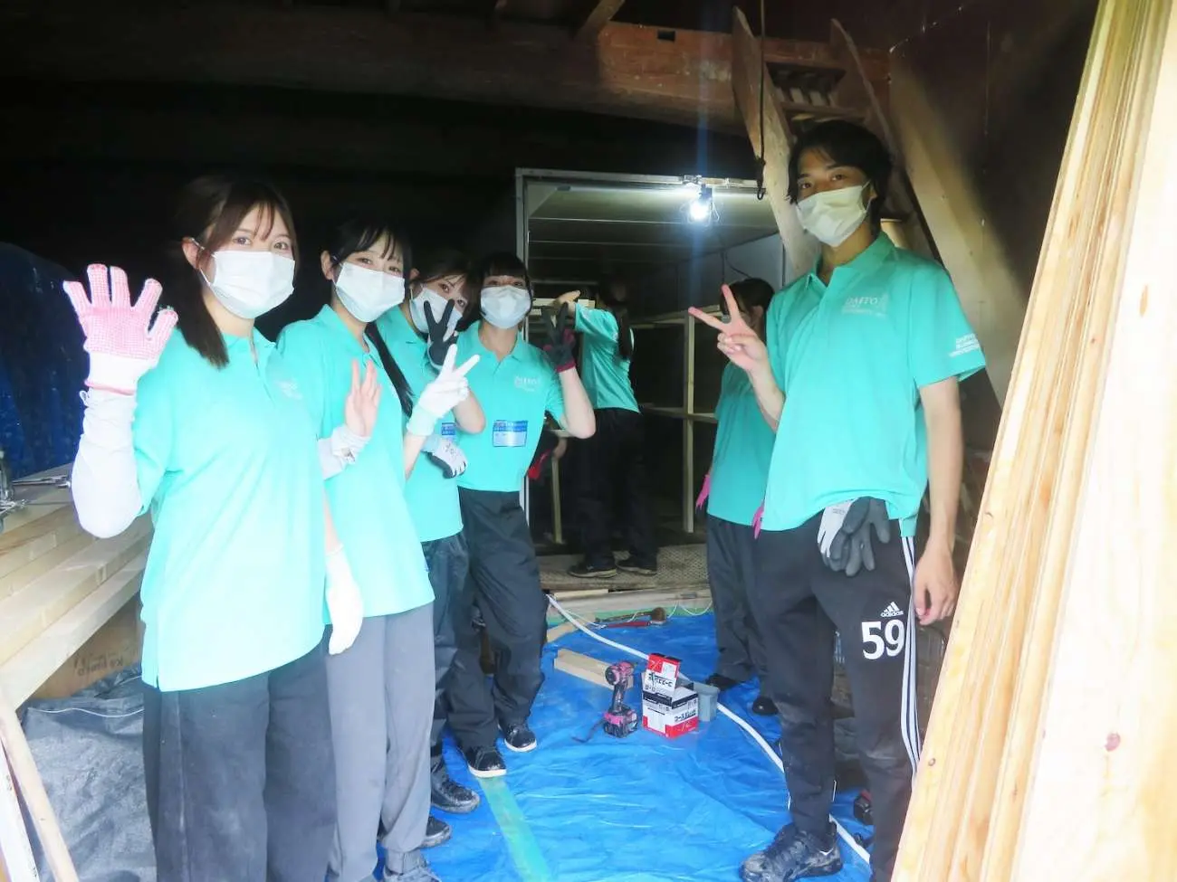 珠洲市での活動は、能登半島地震(2024年1月)、豪雨(同年9月)で被害を受けた陶芸家・渡辺キャロラインさんの家屋の修繕、棚作り。昨年度の活動時とは違い、大雨警戒レベル3の中、ゼミ生たちの活動に対する真摯な姿勢は頼もしく、立派なものでした。