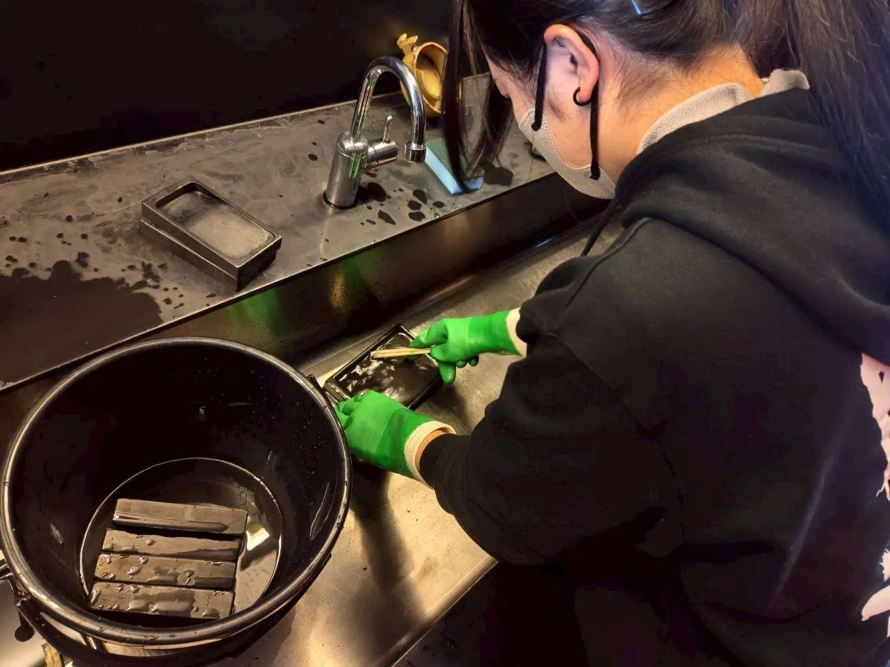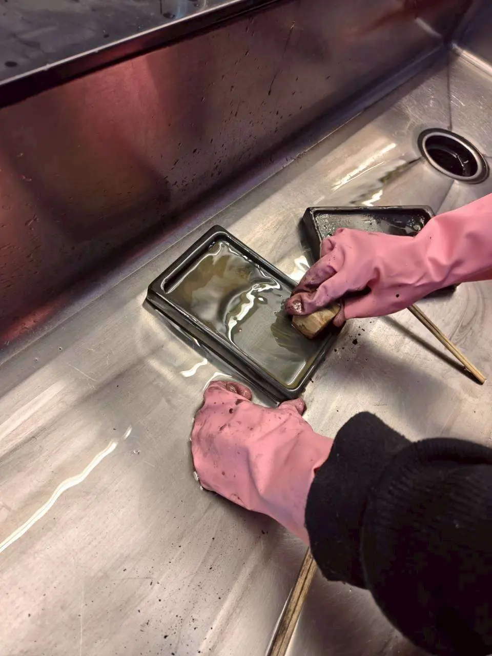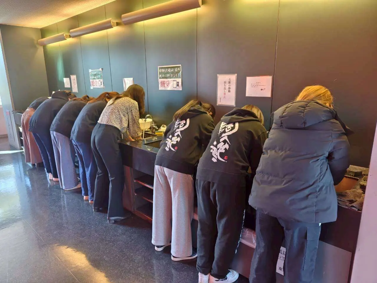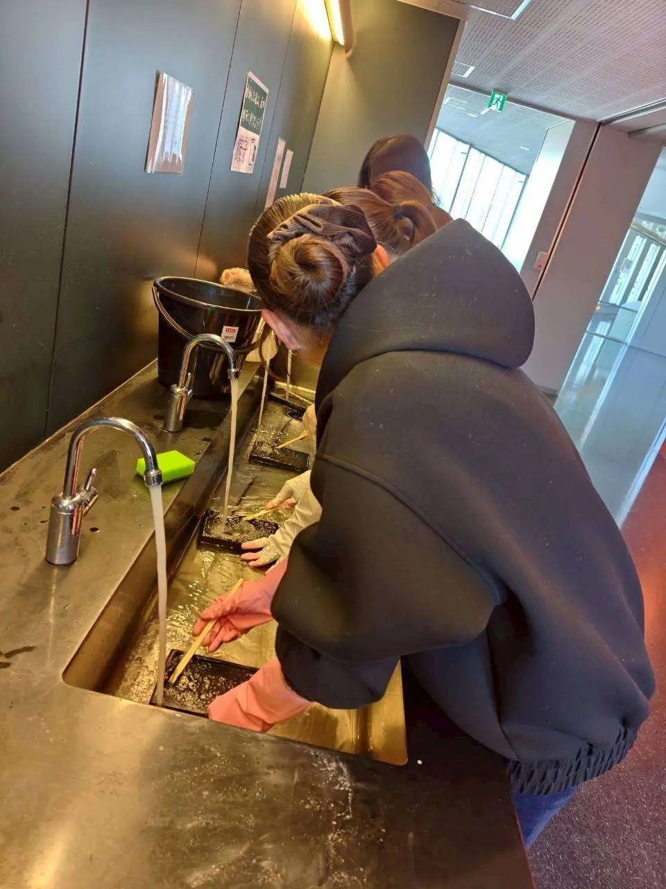 1/10(土)、書道学科1年生の伝統行事である「硯洗い」を東松山校舎で実施しました。「硯洗い」は、汚れた硯を日頃の感謝の気持ちを込めて綺麗に洗うことで、こびりついた墨もお湯につけて割り箸やドライバーで削ぎ落とし、硯の陸(丘・墨堂)に砥石をかけて鋒鋩を立たせて、硯を蘇らせることができました。2年生オリターやTA、4年生の有志が参加してくれたお陰で、一昨々年から復活した(コロナ禍は中止)、硯洗いの伝統を後輩たちへ繋ぐことができました。
