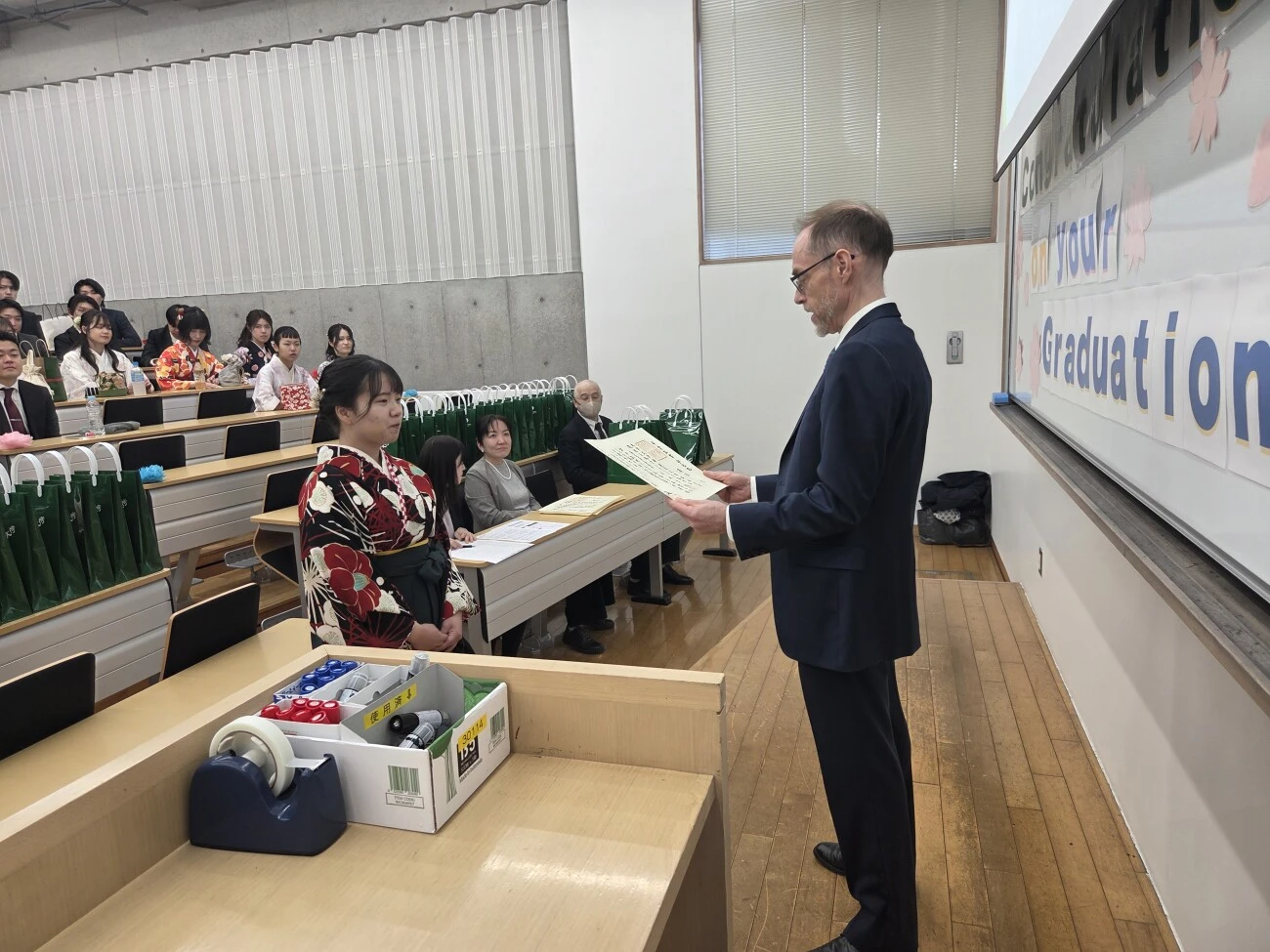 本学科総代として岡部礼さんに学位記が授与された後、学科主任のジョージ・ウォレス