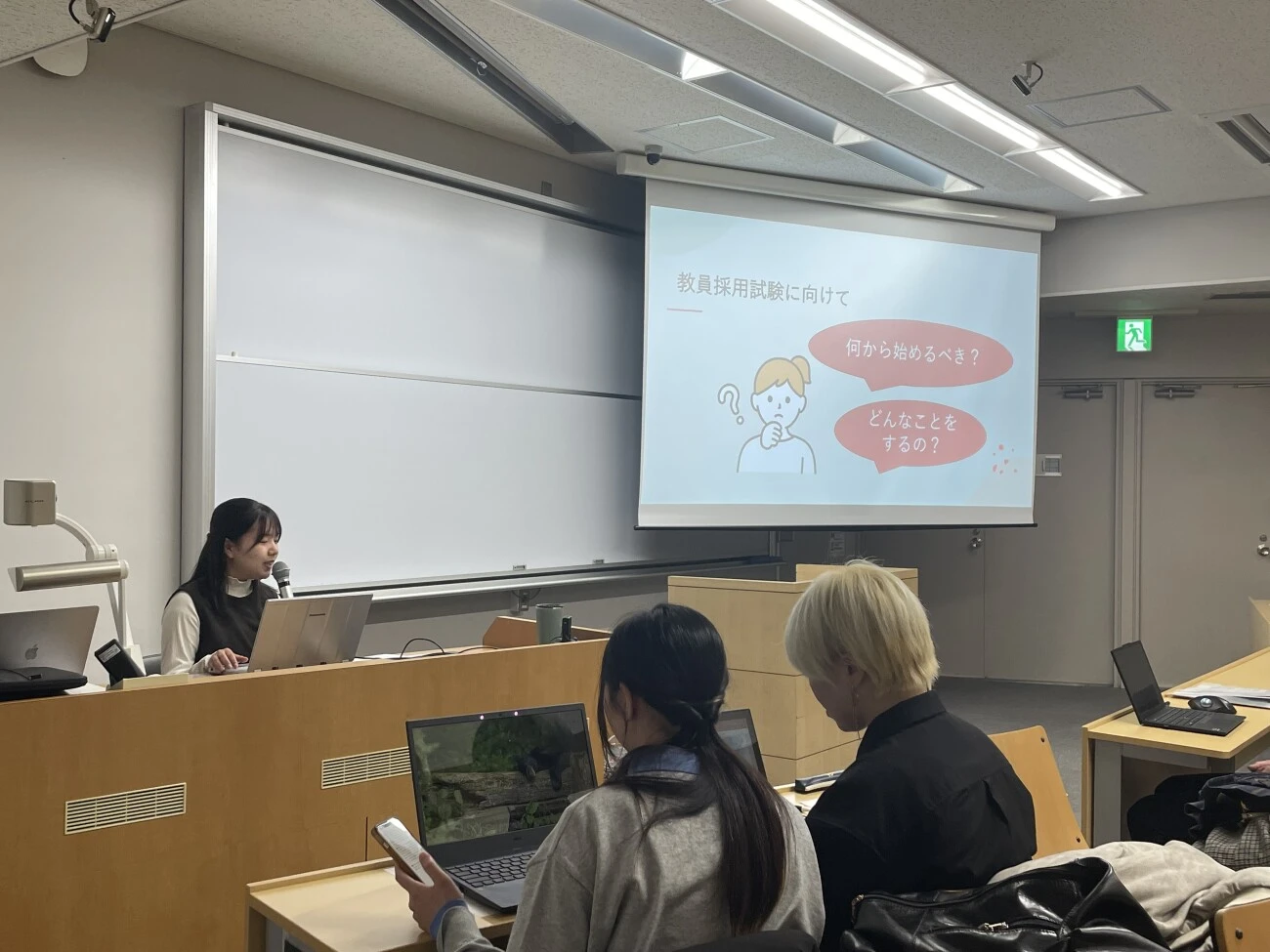 その次は、岡部礼さんが教職を目指す学生に向けての発表をしてくれました。特に、教職セミナー、教員実習、教員採用試験対策について、実際の経験者だからこそ言える具体的な注意点(例:教育実習では水筒は必携!しっかり休憩しリフレッシュすることは大切!など)を話してくださいました。