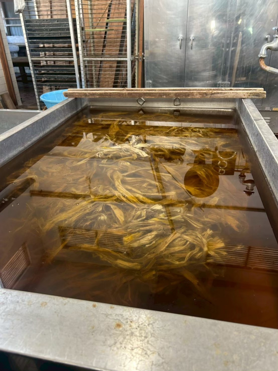 午前中は、和紙の原料となる「楮」の刈り取り作業を体験し、約1.3トン収穫しました。昼食後は、和紙制作の過程が学べる映像を鑑賞し、紙漉きを体験しました。