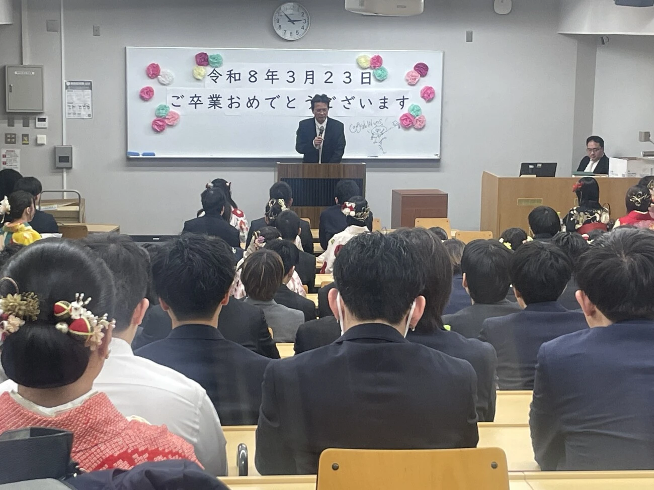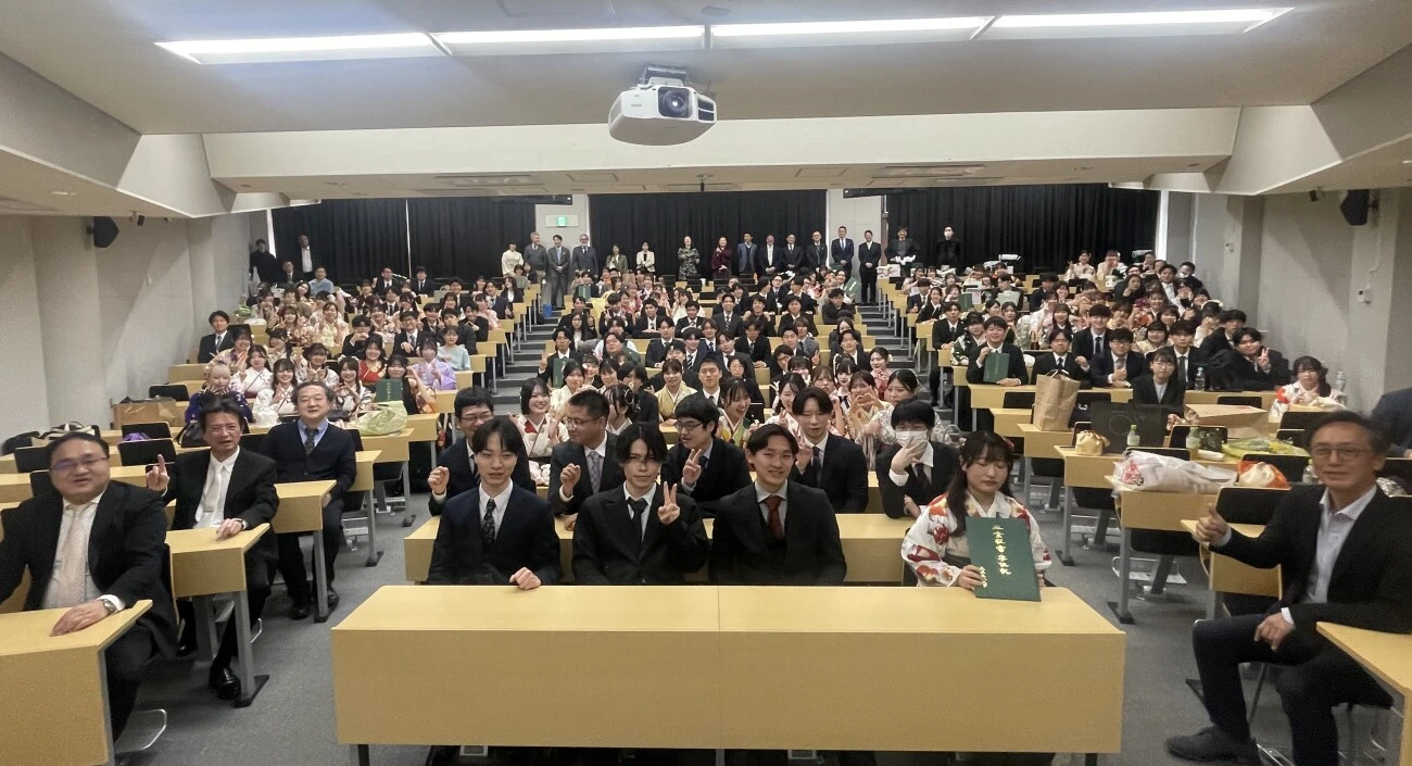 2025年度の学位授与式(卒業式)が3月5日、大東文化大学板橋キャンパスで行われました。社会学科の卒業生およそ170人が参加し、それぞれのゼミの代表者が小湊学部長より学位証書を受け取りました。その後、ゼミごとに学位証書と製本された卒業研究を受け取り、社会に巣立っていきました。