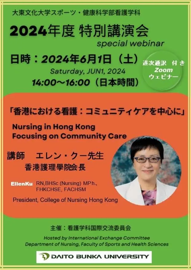 We are truly delighted to announce that Ellen Ku, President, College of Nursing Hong Kong, will be a speaker for our Special Webinar in 2024. President Ku, one of globally renowned, Asian nurse leaders, will speak on "Nursing in Hong Kong Focusing on Community Care." The webinar starts on June 1, at 13:00 (Hong Kong) and 14:00 (Tokyo). Our 400 students and faculty members are excited to attend this extremely fascinating lecture.