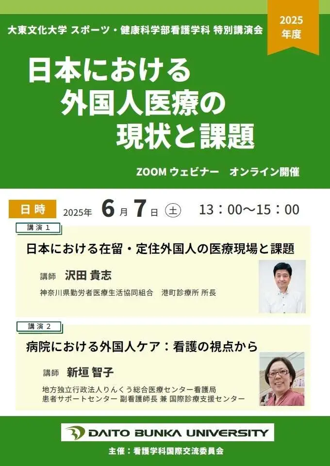 大東文化大学 スポーツ・健康科学部看護学科 国際交流委員会は、学科在校生向けのZoomウェビナーを6月7日(土)13:00~15:00に開催致します。